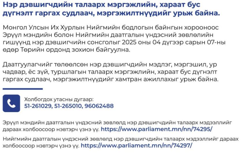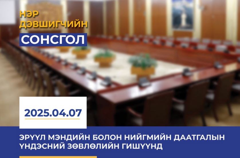 Монгол Улсын Их Хурлын Нийгмийн бодлогын байнгын хорооноос Эрүүл мэндийн болон Нийгмийн даатгалын үндэсний зөвлөлийн гишүүнд нэр дэвшигчийн сонсголыг 2025 оны 04 дүгээр сарын 07-ны өдөр Төрийн ордонд зохион байгуулна.