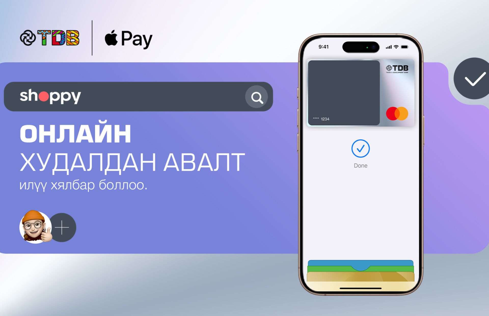 Хэрэв та хараахан Apple Pay-тэй болж амжаагүй бол TDB Online апп-раа дамжуулан эсвэл ЭНД дарж хормын дотор холбоорой