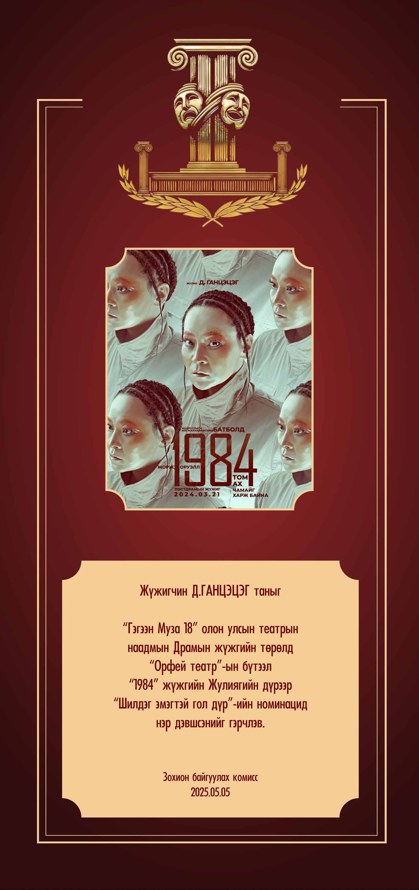 “Гэгээн Муза-18” олон улсын театрын наадамд “Орфей” театрын “1984” жүжгийн Жулиягийн дүрээр шилдэг эмэгтэй жүжигчний номинацид МУГЖ Д.Ганцэцэг нэр дэвшиж байна. Жулия үзэгчдэд дотоод сэтгэлийн ээдрээтэй холбоос, нийгмийн хяналт, хувь хүний эрхийн асуудлыг хүчтэй илэрхийлсэн. Түүгээрээ тэр энэ наадмын гарцаагүй хүчтэй өрсөлдөгч юм. Нийгмийнхээ хатуу харгис байдлыг дагахаас өөр аргагүй хувь тавилантай ч хүнийг хайрлах сэтгэл зүрхээ гээгээгүй. Хэсэгхэн ч болов хайр дурлалын амтыг мэдэрсэн Жулия одоо ч үзэгчдэд дотно санагдсаар буй.