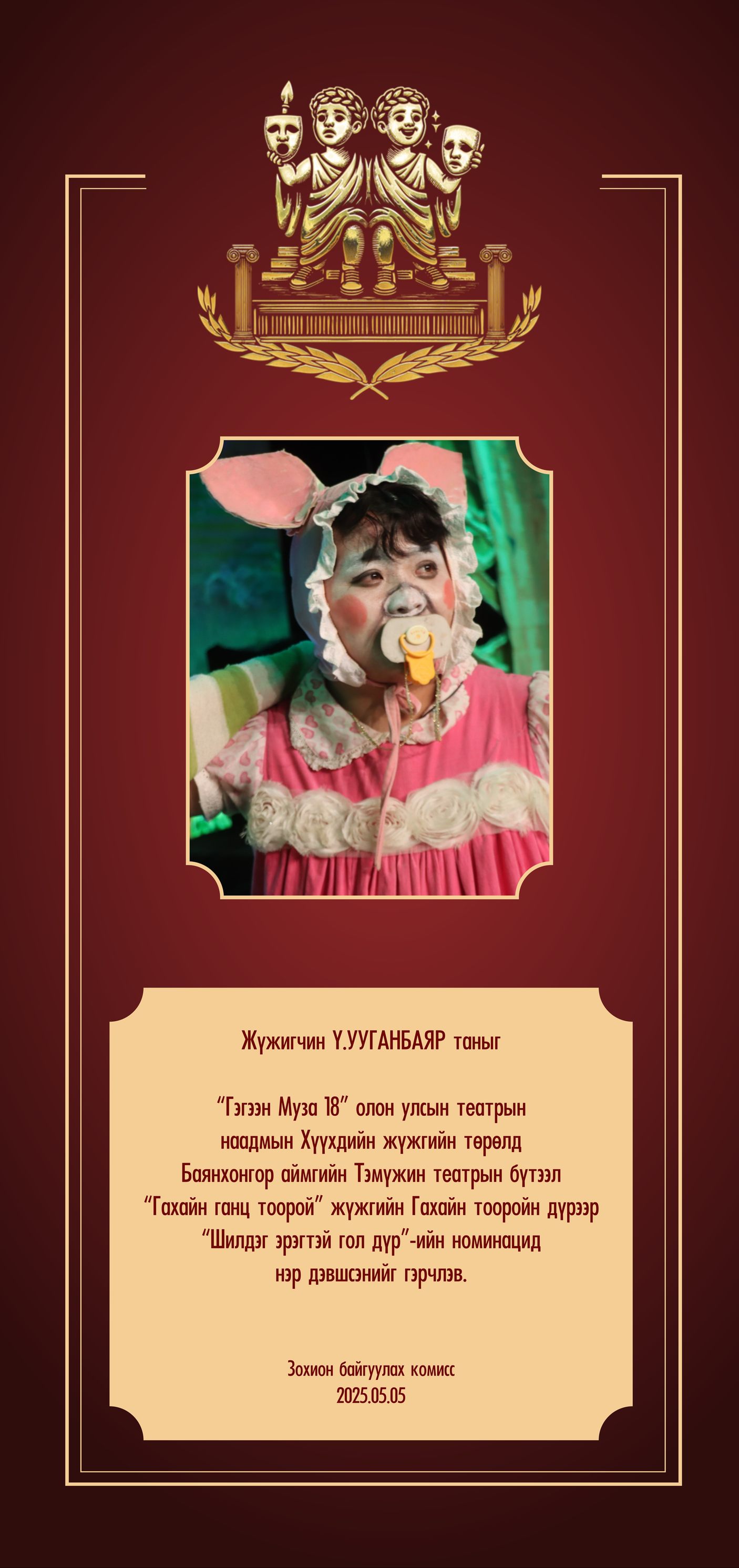 Баянхонгор аймгийн “Тэмүүжин” театрын жүжигчин Ү.Ууганбаяр “Гахайн ганц тоорой” жүжгийн дүрээрээ “Гэгээн Муза-18” олон улсын театрын наадмын шилдэг эрэгтэй жүжигчний номинацид нэр дэвшээд байна. Ү.Ууганбаярын бүтээсэн дүр нь дүрслэл, сэтгэл хөдлөлийн гүн гүнзгий харилцан хамаарлыг илэрхийлснээрээ онцлог байна. Мөн гахайн тоорой, бүтээлч амьдралын мөрөөдөл, зовлон шаналлыг амьдралын өнгө төрхөөр илэрхийлсэн. Тэрбээр жүжигтээ харилцан яриа, биеийн хэлэмжийг маш сайн ашиглан үгийн утга, дүрийн онцлогийг бүрэн нээж чадсан юм. Түүнд амжилт хүсье.