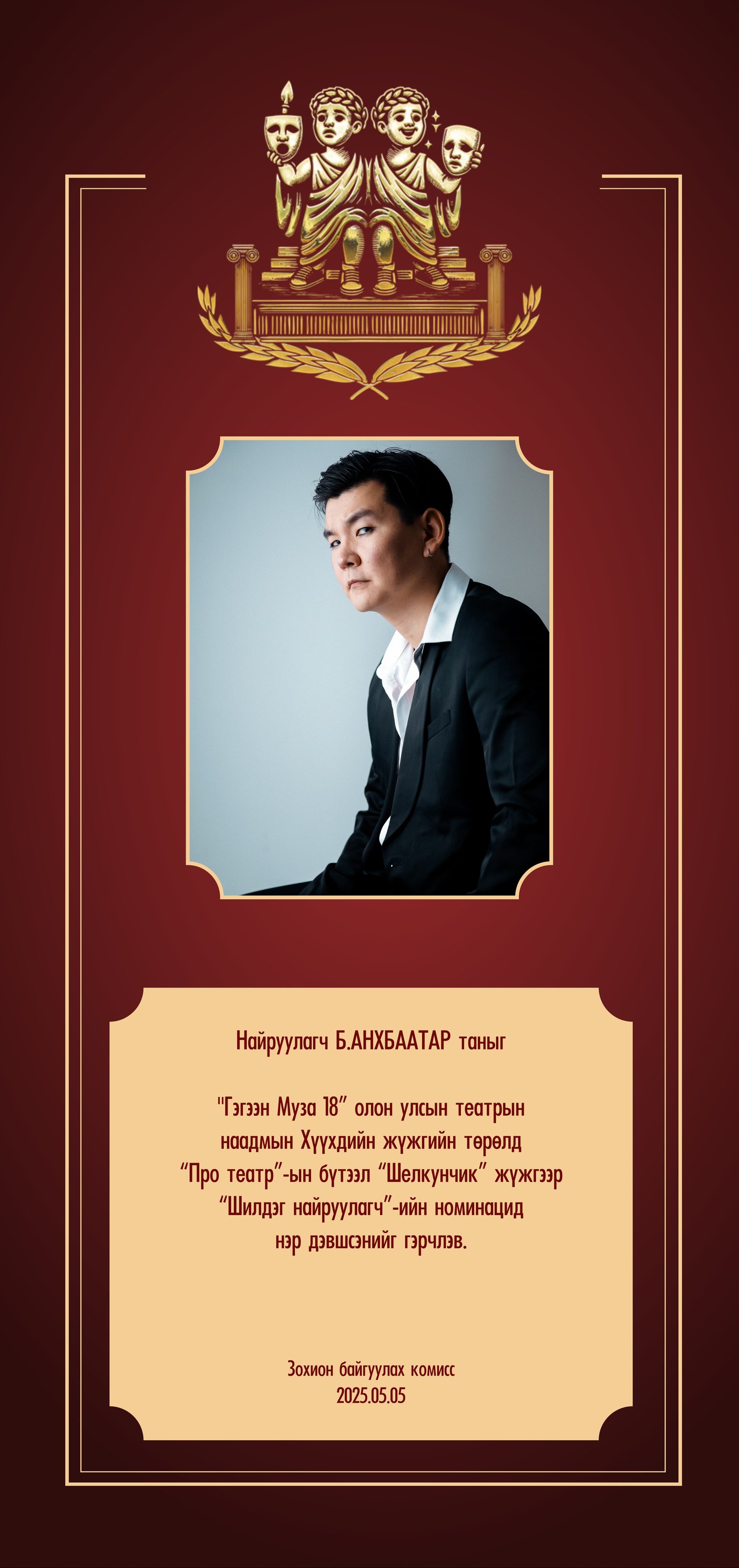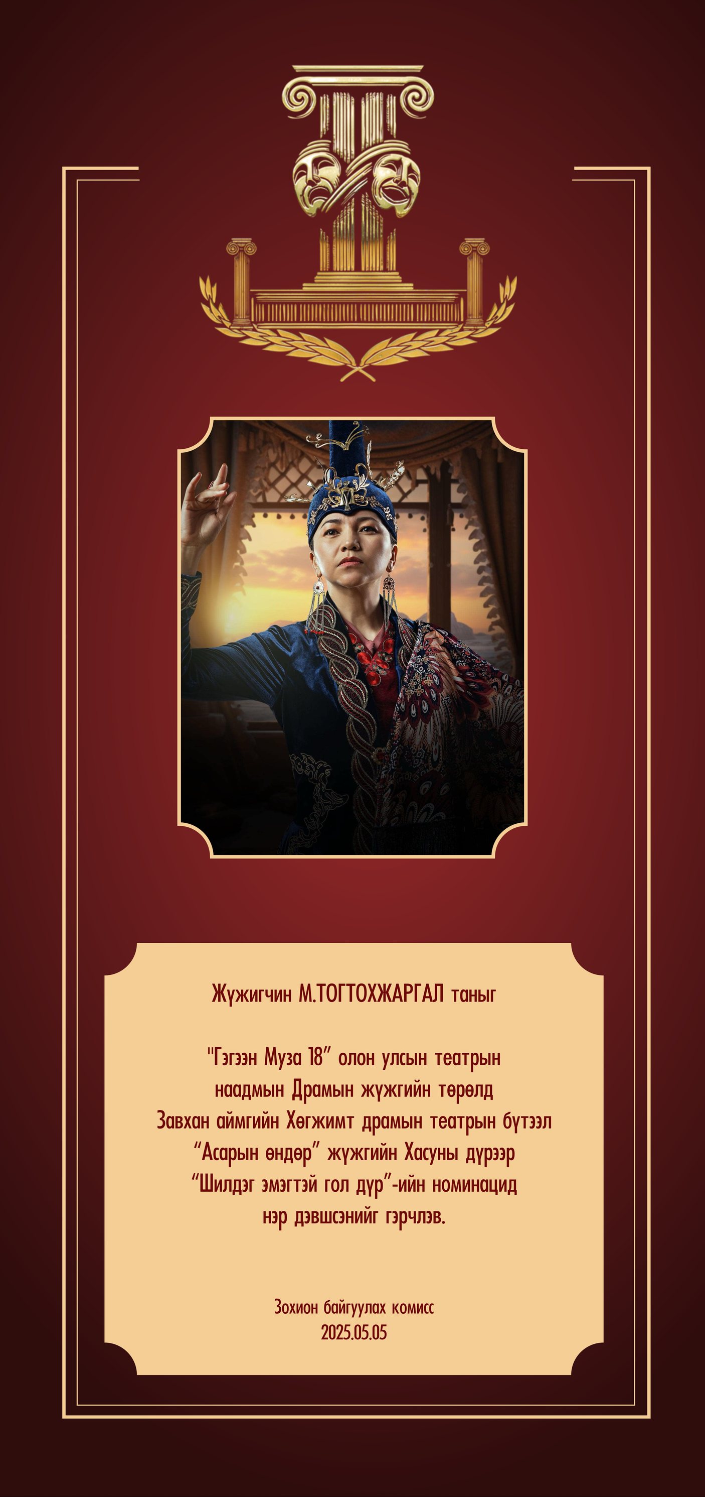 Тайзны гэрэл тусах тэр мөч бол уран бүтээлчийн олон сарын хөлс хөдөлмөр, сэтгэлийн хүчээр бүтсэн дүрээ амилуулах агшин юм. “Гэгээн Муза-18” наадамд нэр дэвшигчдээс дараах уран бүтээлчдийг онцлон танилуулж байна.