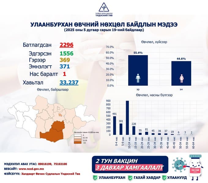 | Улаанбурхан өвчний лабораториор батлагдсан тохиолдол 2296 болжээ |