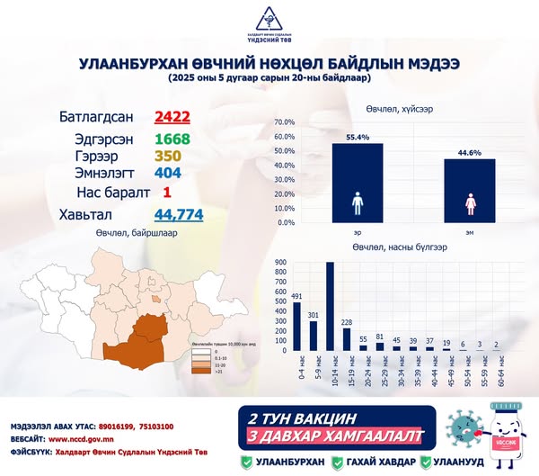 Халдварт өвчин судлалын үндэсний төвөөс Улаанбурхан өвчний нөхцөл байдлын талаар мэдээлэл өглөө. Өнөөдөр буюу 2025 оны тавдугаар сарын 20-ны байдлаар нийт улаанбурхан өвчний лабораториор батлагдсан 2422, эмнэлэгт хэвтэн эмчлүүлж байгаа 404, гэрээр 350, эдгэрсэн 1668, Хавьтал 44774, нэг хүн нас барсан байна. Улаанбурхан өвчин нь халдварлалт өндөртэй ч вакцинаар сэргийлэгдэх боломжтой халдварт өвчин юм. Улаанбурхан өвчний тохиолдлууд ихэвчлэн Ерөнхий боловсролын сургуульд голомтлон гарч байгаатай холбоотой хамт сурдаг, ажиллаж байгаа хүүхэд, иргэд халдвараас сэргийлэх үүднээс улаанбурханы эсрэг вакцинд хамрагдан өөрийгөө болон бусдыг улаанбурхан өвчнөөс хамгаалах боломжтой юм. Эрүүл мэндийнхээ төлөө иргэн бүр хариуцлагатай байж, халдвараас сэргийлцгээе.