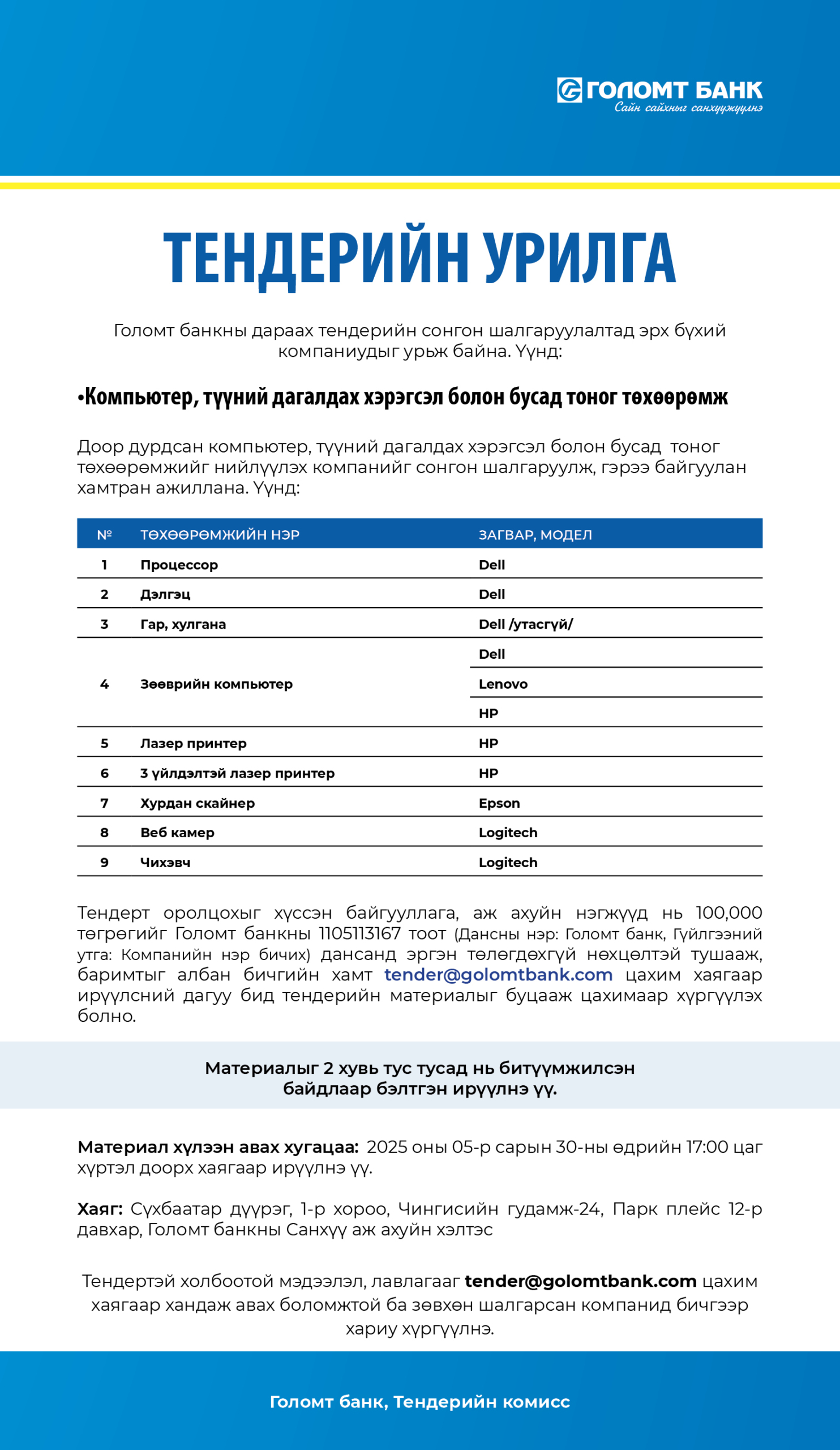 | Голомт банкны тендерийн сонгон шалгаруулалтад урьж байна |