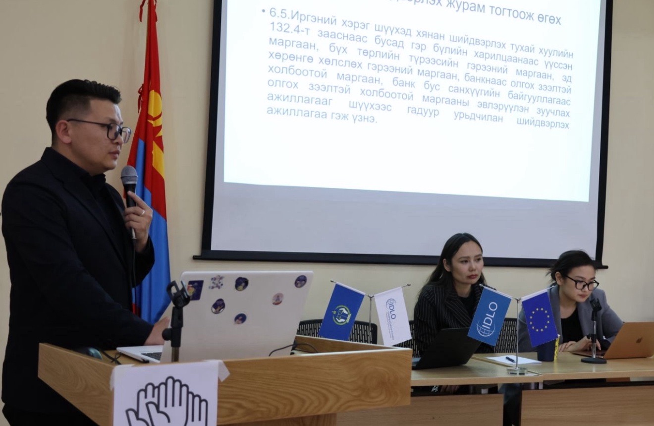 Мөн Олон улсын эрх зүйн хөгжлийн байгууллагын үндэсний зөвлөх, хуульч, судлаач Г. Цагаанбаяр Эвлэрүүлэн зуучлалын тухай хуулийн шинэчилсэн найруулгын төслийн талаар танилцуулав.