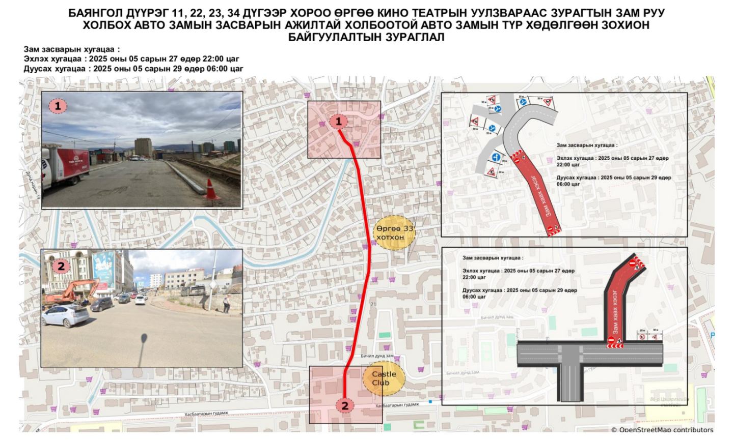 | “Өргөө” кино театрын хойд уулзвараас Зурагтын зам хүртэлх авто замыг хэсэгчлэн хааж, шинэчилнэ |