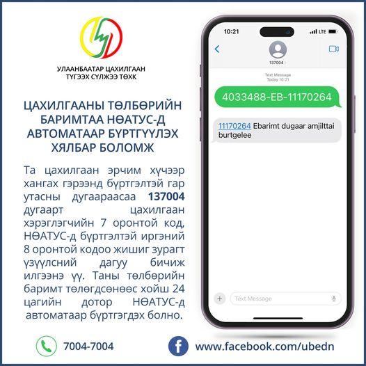 Та цахилгаан эрчим хүчээр хангах гэрээнд бүртгэлтэй гар утасны дугаараасаа 137004 дугаарт цахилгаан хэрэглэгчийн 7 оронтой код, НӨАТУС-д бүртгэлтэй иргэний 8 оронтой кодоо жишиг зурагт үзүүлсний дагуу бичиж илгээнэ үү. Таны төлбөрийн баримт төлөгдсөнөөс хойш 24 цагийн дотор НӨАТУС-д автоматаар бүртгэгдэх болно.