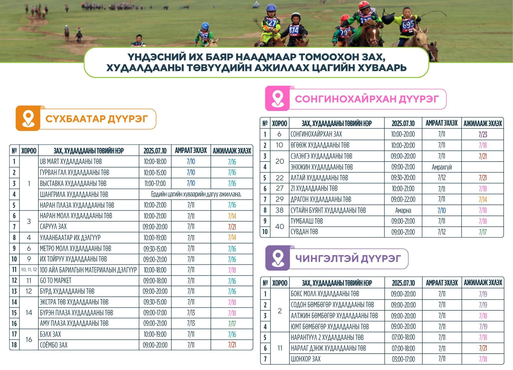 | Баяр наадмын өдрүүдээр ажиллах зах, худалдааны төвийн хуваарь |