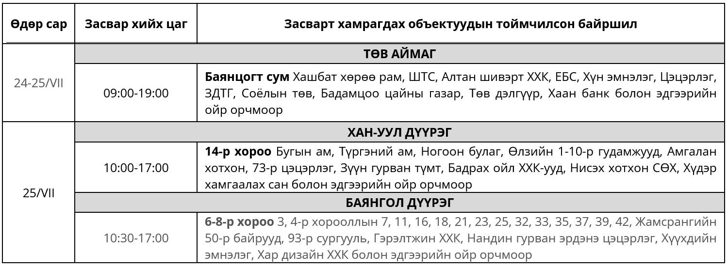 Өнөөдөр буюу 2025 оны долоодугаар сарын 25-ны Баасан гарагт цахилгаан шугам сүлжээнд хийх засварын хуваарийг танилцуулж байна. Хэрэглэгчид ээ, засвар хийх хугацаанд хэрэглээгээ түр зохицуулна уу.