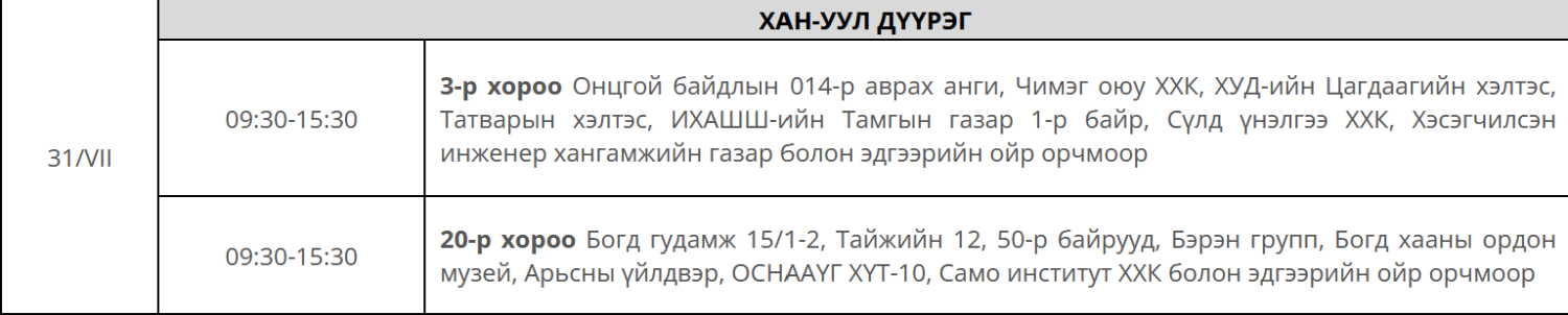Өнөөдөр буюу 2025 оны долоодугаар сарын 31-ний Пүрэв гарагт дараах байршилд цахилгаан хязгаарлаж, шугам сүлжээнд засвар хийнэ.