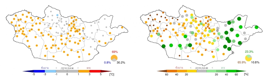 Сарын дундаж агаарын температурын олон жилийн дунджаас хазайх байдлыг орон зайн хэмжээнд авч үзэхэд, нийт нутгийн 69 хувь нь дунджаас 1.0-3.0°С-аар дулаан, 30.2 хувь нь дунджаас ойролцоогоор ижил, харин 0.8 хувь нь хүйтэн байжээ. Монгол орны хэмжээнд өнгөрсөн сард дунджаар 47.3 мм хур тунадас орсон нь өмнөх жилээс 26 хувиар, олон жилийн дунджаас 7.9 хувиар бага байгаа нь 1940 оноос хойшхи 27 дахь хамгийн бага тунадастай сар болж байна. Тус сард агаарын температурын үнэмлэхүй их утга Баянхонгор аймгийн Эхийнголд 41.3°С, үнэмлэхүй бага утга Хөвсгөлийн аймгийн Чандагат суманд -1.2°С хүрсэн байна. Харин хөрсний температурын үнэмлэхүй их утга Улаанбаатар хотод 68°С, хамгийн бага утга нь Хөвсгөлийн Чандагат суманд -3°С байжээ. Хоногт хамгийн их тунадас Хэнтий аймгийн Баян-Овоо суманд долдугаар сарын 9-нд 66.6 мм орсон бол даралтын үнэмлэхүй их утга Сэлэнгийн Сүхбаатар суманд 942.5 гПа, бага утга Баянхонгор аймгийн Баянбулаг суманд 766.6 гПа хүрчээ. Салхины хурд хамгийн их нь Төв аймгийн Эрдэнэсант суманд 33 м/с-д хүрсэн байна.