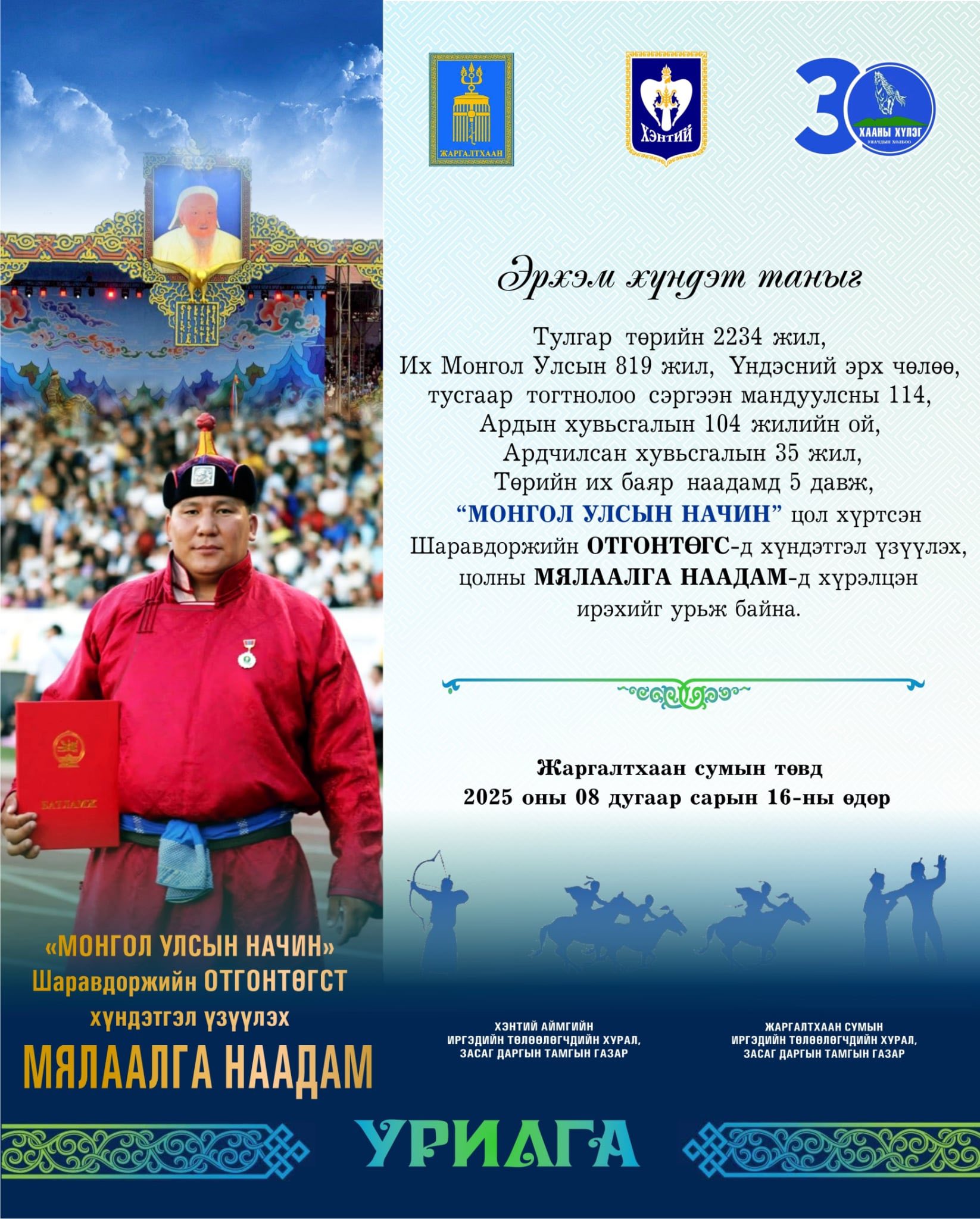 Тулгар төрийн 2234, Их Монгол улс байгуулагдсаны 819, Үндэсний эрх чөлөө, тусгаар тогтнолоо сэргээн мандуулсны 114, Ардын хувьсгалын 104, Ардчилсан хувьсгалын 35 жилийн ой, Төрийн их баяр наадамд тав давж “МОНГОЛ УЛСЫН НАЧИН” цол хүртсэн Хэнтий аймгийн Жаргалтхаан сумын харьяат Шаравдоржийн Отгонтөгсийн цолны мялаалга наадам 2025 оны наймдугаар сарын 16-ны өдөр Жаргалтхаан суманд болох байна.