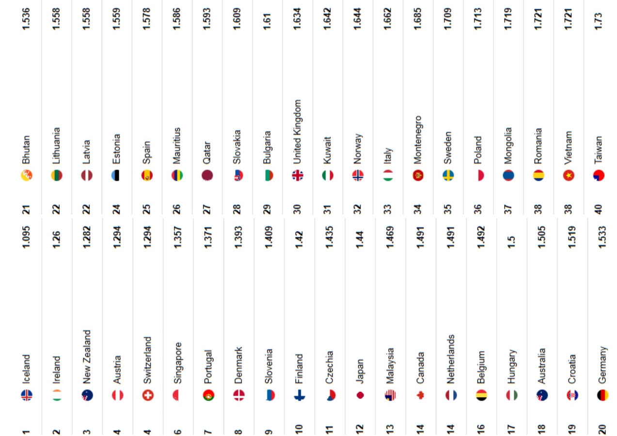Исланд Улс 2008 оноос хойш тасралтгүй хамгийн аюулгүй орноор тодорч буй бөгөөд цэрэгжилтийн түвшин маш бага, зөрчил мөргөлдөөнгүй, цагдаа нар нь хүртэл зэвсэггүйгээр ажилладаг гэдгээрээ онцлог. Хоёрдугаар байранд Ирланд, Шинэ Зеланд хоёр байр ахиж гуравт бичигджээ. Австри, Швейцарь улсууд төвийг сахисан бодлого, энхийг сахиулах уламжлалаа хадгалж ирсэн тул дэлхийн хамгийн аюулгүй орны эхний тавд багтжээ. Манай улс өмнөх жилээс найман байр ахиж, 37-р байрт орсон нь олон улсын хэмжээнд Монголын аюулгүй байдлын түвшин нэмэгдсэнийг харуулж байна. Судалгаанд дурдсанаар манай улсын хувьд: