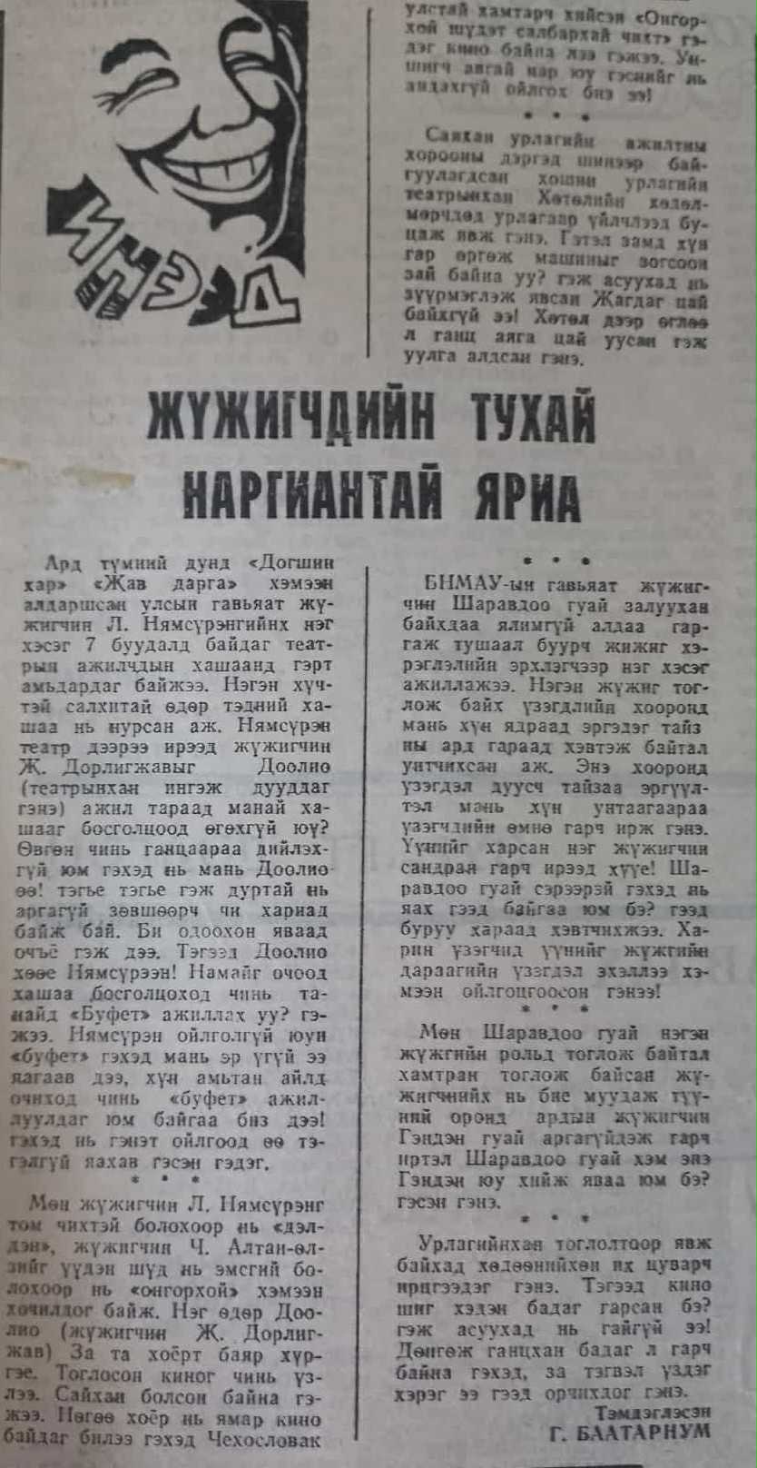 -Сүүлд аавтай хамт ажиллаж байсан уран бүтээлчидтэй уулзаж байхад аавыг их шооч хүн байсан гэж ярьж байсан. Бас их хошин мэдрэмжтэй хүн байсан би боддог юм. Аавыг байхад манайд уран бүтээлчид, жүжигчид, аавын найзууд их ирдэг байсан. Тэдний яриаг сонсоод л баймаар санагддаг байж билээ. Их гоё ярьдаг, сайхан хүн зөндөө байсан. Тэд гэрт ирчихээд уран бүтээл, дүрийнхээ талаар ярихаас гадна чин сэтгэлийн, найз нөхдийн яриа их өрнүүлдэг байсан санагддаг юм.