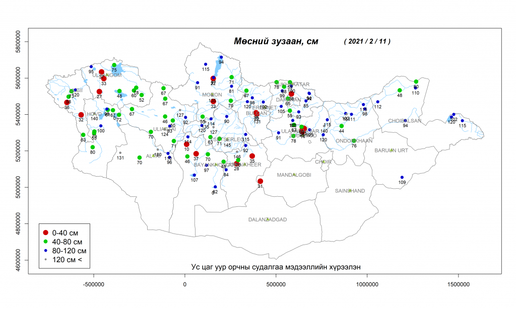 Цаг уурын байгууллагын ирүүлсэн мэдээллээр Монгол орны ихэнх гол мөрөн, нууранд тогтвортой мөсөн бүрхүүл тогтож, жижиг голууд ёроолдож хөлдсөн бөгөөд мөсний зузаан өмнөх арав хоногийнхоос 5-30 см нэмэгджээ. Эг, Бэлтэс, Шишхэд, Идэр, Хануй, Чулуут, Хүдэр, Хараа, Ерөө, Сэлэнгэ, Орхон, Онон, Балж, Хэрлэн голын эх, Халх, Ховд, Турган, Буянт, Заг, Шаргалжуут, Цагаантуруут, Онги, Хархираа зэрэг голуудын мөсний зузаан өмнөх оны мөн үеийнхээс 15-50 см нимгэн мөсөн бүрхүүлтэй байгаа аж. Хэдийгээр ихэнх гол мөрөн, нуур битүү мөсөн бүрхүүлтэй болсон мөс улам зузаарч байгаа ч зарим гол мөрний мөсний зузаан өмнөх арав хоногийнхоос 5-20 см нимгэрч мөс хэврэгшиж, мөсний нягт багассан байна. Иймд нуурын толио болон гол мөрний нийт уртын дагууд мөсний зузаан харилцан адилгүй, мөсний даац хүн, мал, машин тэрэг явахад аюулгүй хэмжээнд хүрч бэхжээгүй тул цаг хожих, зам товчлох зэргээр мөсөн дээгүүр явах болон авто тээвэр хийхгүй байхыг онцгойлон анхаарууллаа.