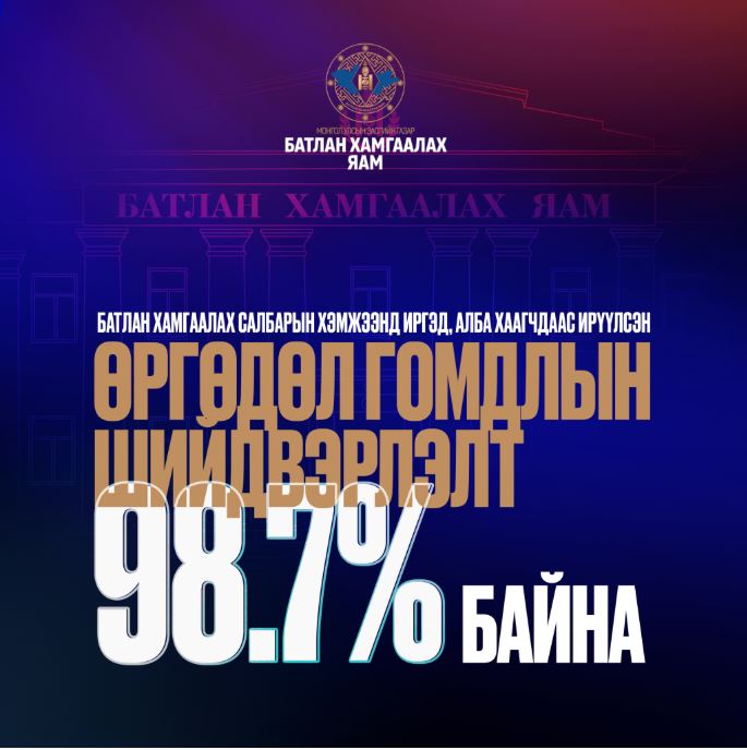 | БАТЛАН ХАМГААЛАХ САЛБАРЫН ХЭМЖЭЭНД ИРГЭД, АЛБА ХААГЧДААС ИРҮҮЛСЭН ӨРГӨДӨЛ ГОМДЛЫГ 98,7 ХУВЬТАЙ ШИЙДВЭРЛЭЛЭЭ |