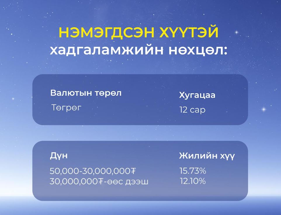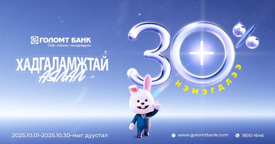 Та 2025.10.01-2025.10.30-ны хооронд үргэлжлэх 30 хоногийн хугацаанд 30%-ийн нэмэгдэлтэй хүүгээр буюу жилийн 15.73%-ийн хүүгээр шинэ хадгаламж нээлгэх боломжтой. Ингэхдээ заавал 12 сарын хугацаатай хадгаламж нээлгэх бөгөөд хадгаламж нээх анхны дүн 50,000₮-өөс дээш байхыг битгий мартаарай.