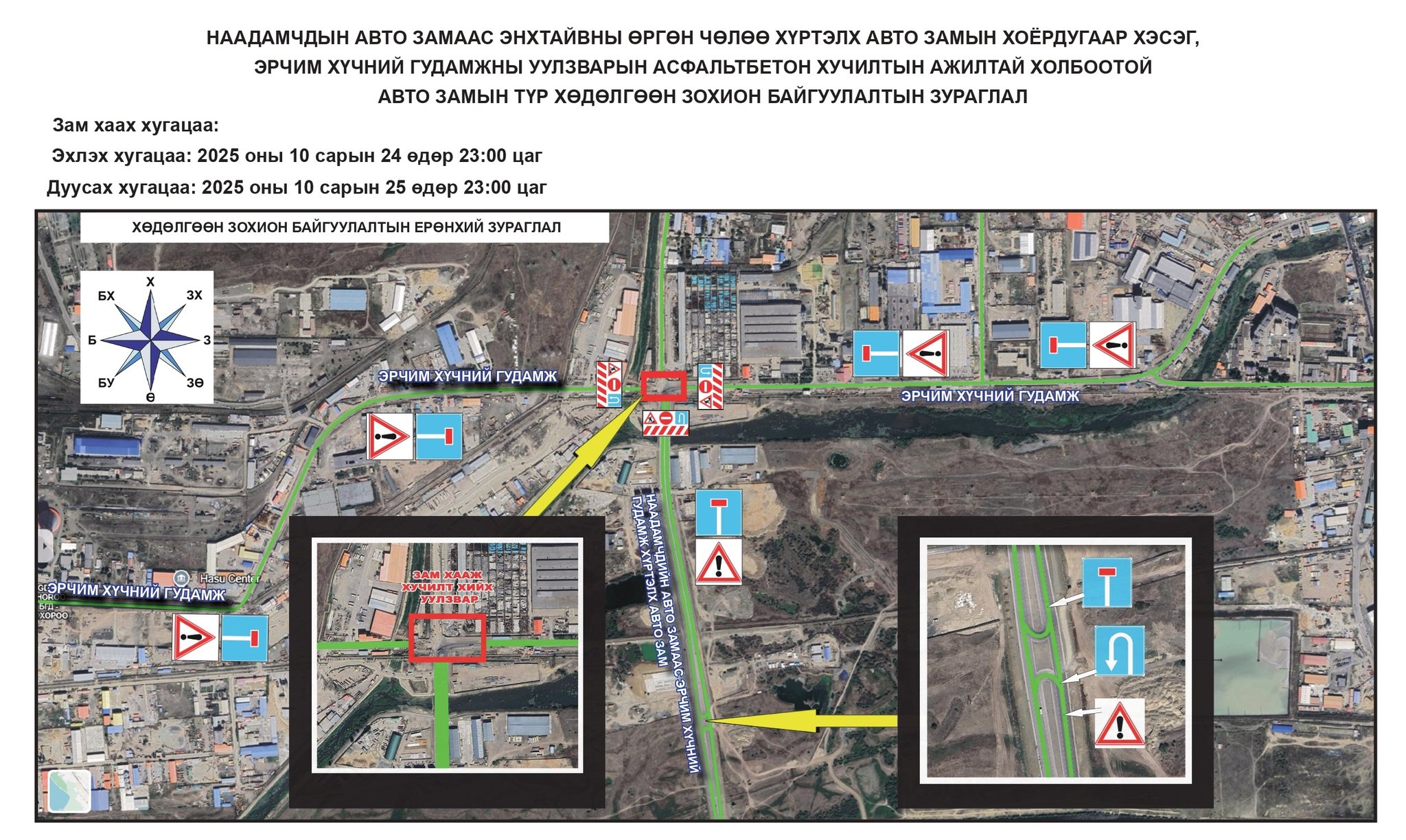 Баянгол дүүргийн 20-р хороо Наадамчдын авто замаас Энхтайваны өргөн чөлөө хүртэлх авто замын хоёрдугаар хэсэг, Эрчим хүчний гудамжны уулзварыг 2025 оны 10-р сарын 24-ний 23:00 цагаас 2025 оны 10-р сарын 25-ны 23:00 цагийн хооронд хааж асфальтбетон хучилтын ажил хийнэ. Иймд иргэд, жолооч та бүхэн бусад замыг сонгон хөдөлгөөнд оролцоно уу.