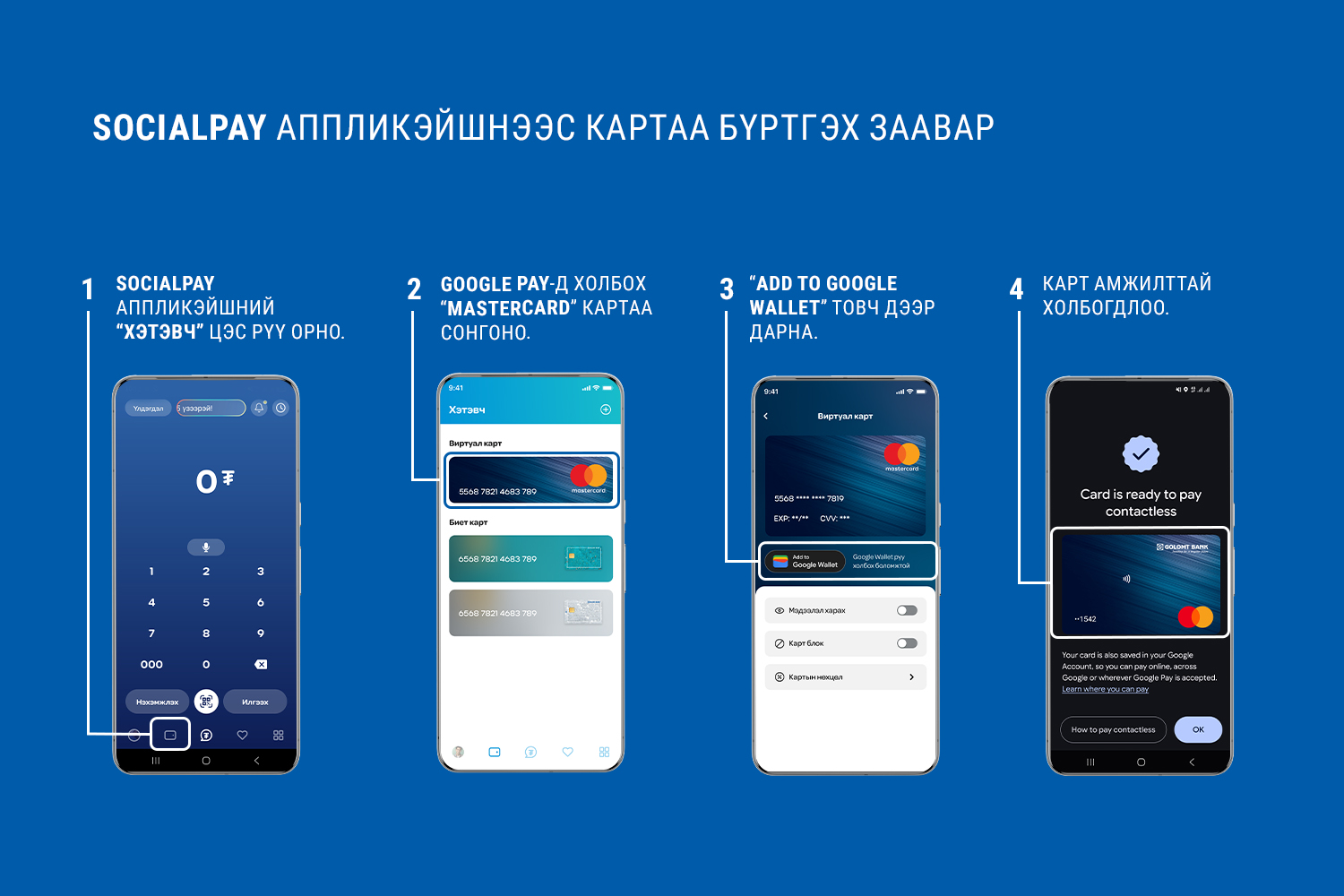 Голомт банкны бүх төрлийн Mastercard болон T брэндийн картыг SocialPay аппликэйшнээр дамжуулан Google Pay-д холбон ашиглах боломжтой.