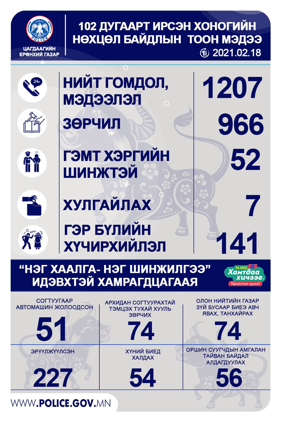 Цагдаагийн байгууллагад өнгөрсөн 24 цагийн хугацаанд 1207 гомдол, мэдээлэл ирсэн байна. Үүнээс 966 зөрчил, гэмт хэргийн шинжтэй 52, хулгайлах долоо, гэр бүлийн хүчирхийлэл 141 мэдээлэл бүртгэгдсэн байна. Мөн согтуугаар автомашин жолоодсон 51, архидан согтуурахтай тэмцэх тухай хууль зөрчсөн 74, олон нийтийн газар зүй бусаар биеэ авч явах, танхайрах 74, эрүүлжүүлсэн 227, хүний биед халдах 54, оршин суугчдын амгалан тайван байдал алдагдуулах 56 гомдол, мэдээлэл бүртгэгдсэн байна.