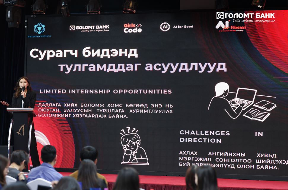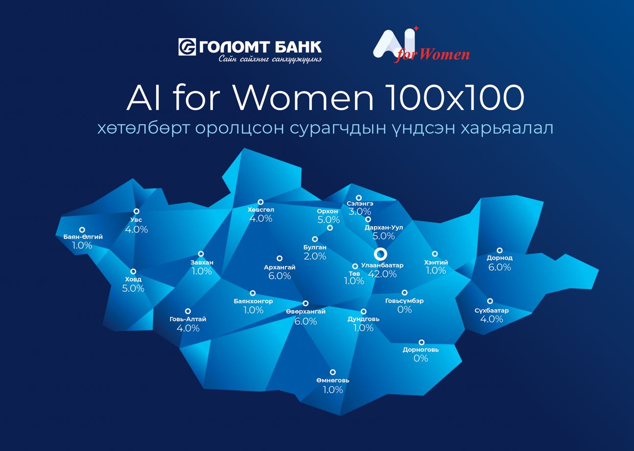 Боловсролыг дэмжигч Голомт банк нийгмийн хариуцлагын хүрээнд эх орны ирээдүй болсон оюутан, сурагчдын мэдлэг, ур чадварыг хөгжүүлэх, санхүүгийн дэмжлэг үзүүлэх, тэдний хөдөлмөр эрхлэлтийг дэмжих зорилгоор цөөнгүй төсөл хөтөлбөрийг хэрэгжүүлдэг. Энэ удаа мэдээллийн технологийн салбар дахь эмэгтэйчүүдийн манлайллыг нэмэгдүүлэн боловсролын салбарт технологийн дэвшлийг нэвтрүүлэхээр AI Academy Asia-тай хамтран ажиллалаа. Хамтын ажиллагааны хүрээнд ЕБС-ийн эмэгтэй сурагч, багш нарын оюуны хөрөнгө оруулалтад зориулан “AI for Women 100x100” хөтөлбөрийг амжилттай хэрэгжүүлж, оролцогчид хөтөлбөрөөс сурч, мэдсэнээ тайлагналаа.