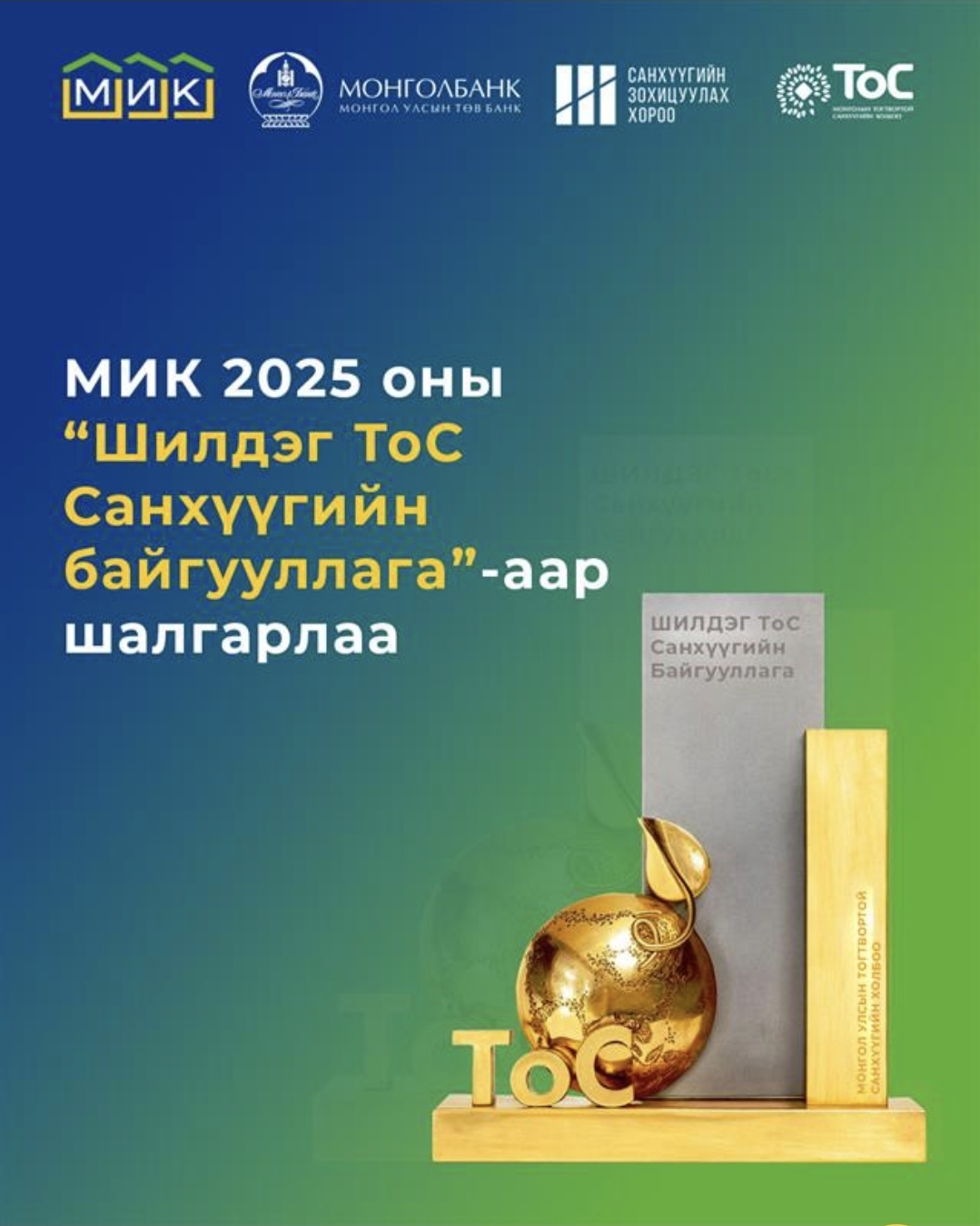 2025 оны 12 дугаар сарын 10-ны өдөр Монголын Тогтвортой Санхүүжилтийн холбоо, Монголбанк, Санхүүгийн зохицуулах хороотой хамтран энэ жилийн салбарын шилдгүүдийг тодрууллаа. Уг арга хэмжээний үеэр 2025 оны “Шилдэг ТоС санхүүгийн байгууллага”-аар Монголын Ипотекийн Корпораци (МИК) шалгарсан байна.