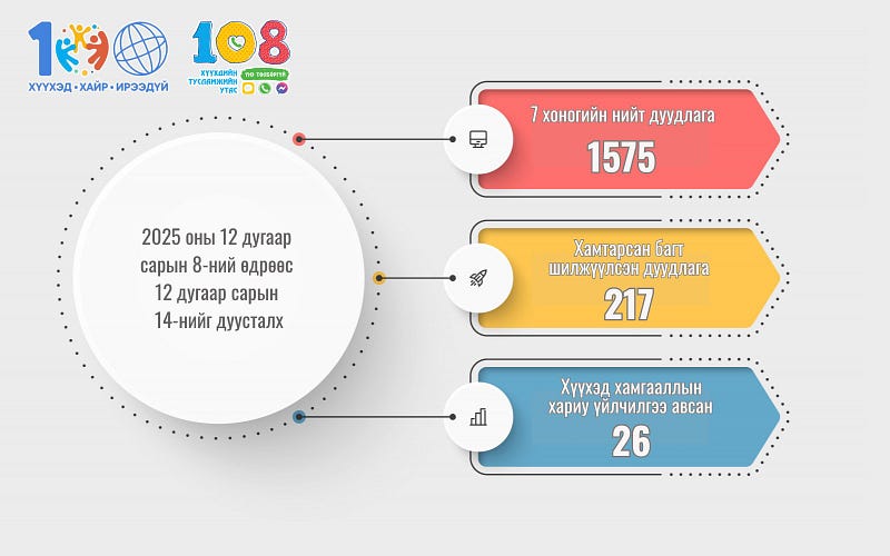 | Хүүхдийн тусламжийн 108 утсанд долоон хоногийн хугацаанд 1575 дуудлага иржээ |