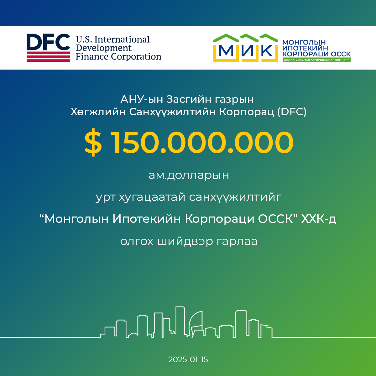 “Монголын Ипотекийн Корпораци ОССК” ХХК (МИК)-д Америкийн Нэгдсэн Улсын Хөгжлийн Санхүүжилтийн Байгууллагаас (DFC) 150 сая ам.долларын санхүүжилтийн эх үүсвэрийг урт хугацаатайгаар олгох шийдвэрийг 2025 оны 1 дүгээр сарын 15-ны өдөр гаргалаа.