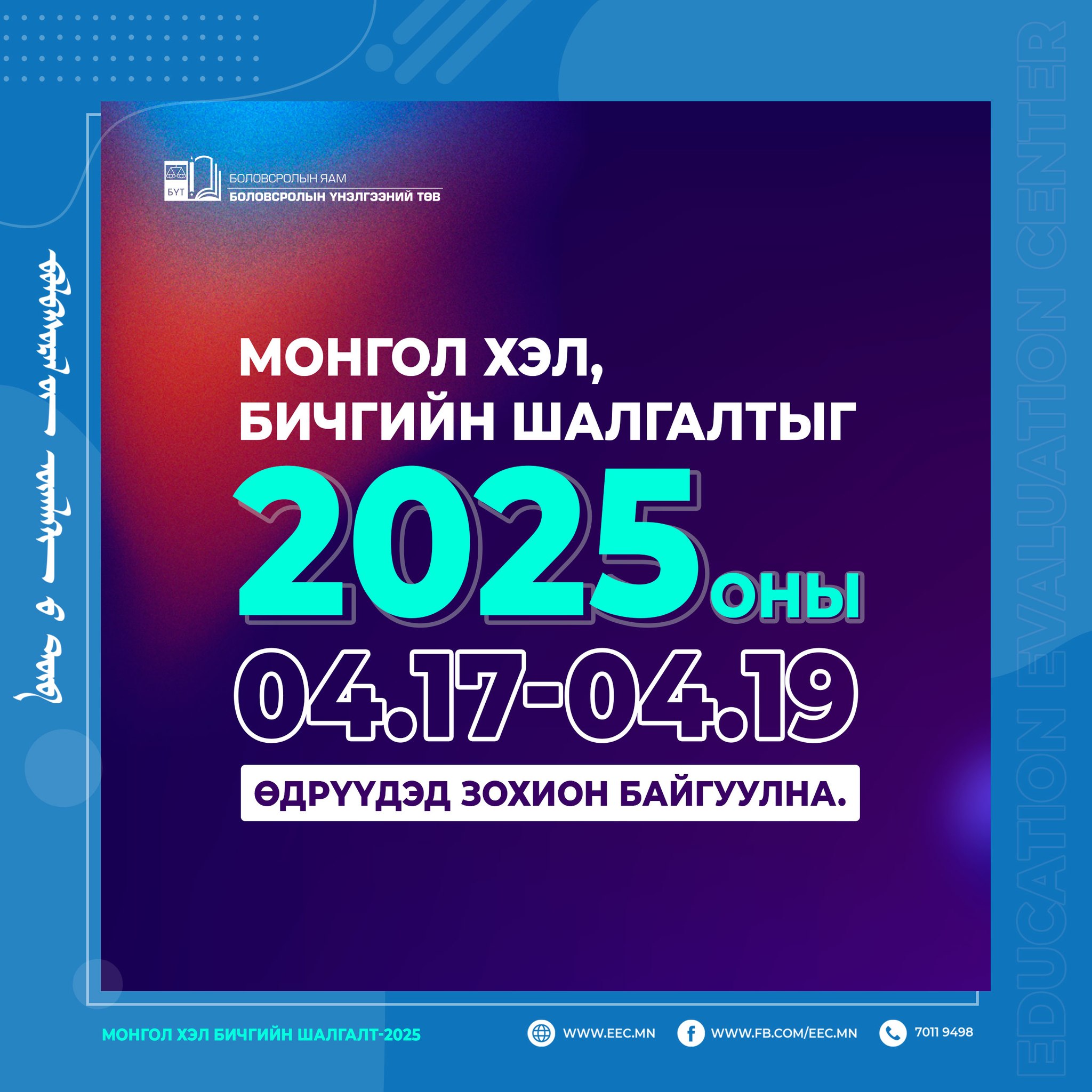 2025 оны Монгол хэл, бичгийн шалгалт 04 дүгээр сарын 17-ноос 04 дүгээр сарын 19-ний өдрүүдэд зохион байгуулагдана.