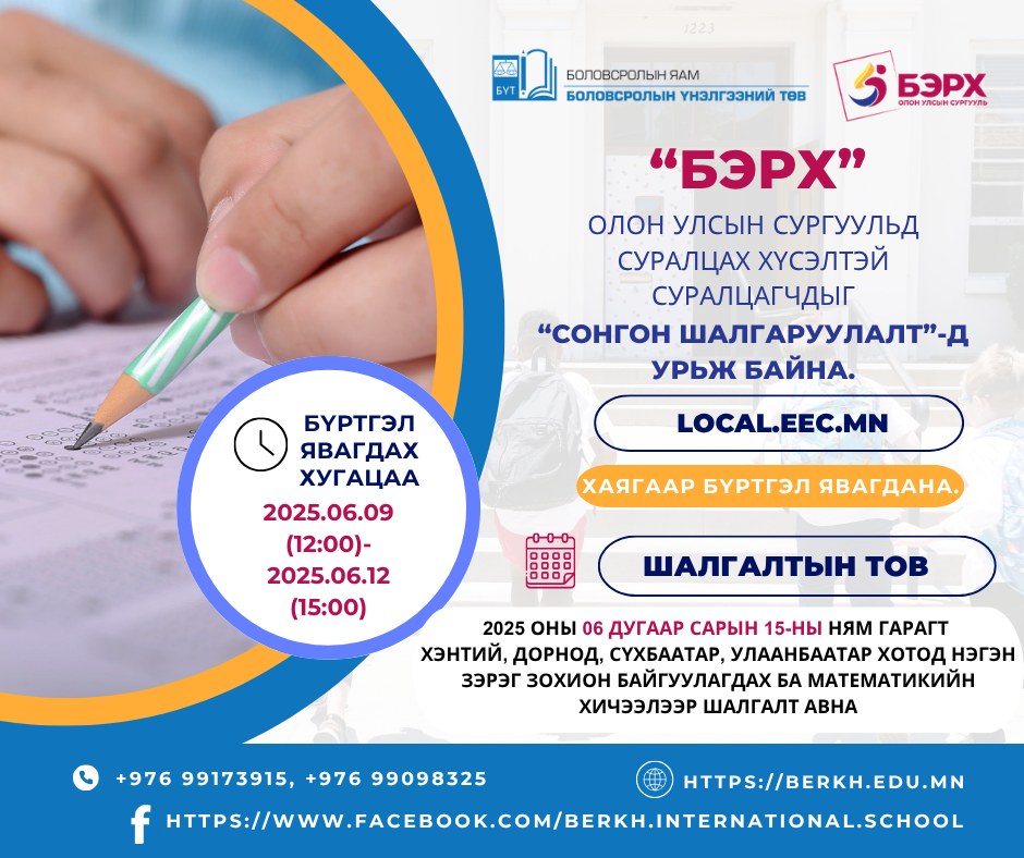 Хэнтий аймгийн Бэрх хотод байрлах зүүн бүсийн Олон улсын хөтөлбөрийн сургалттай ЕБ-ын Бэрх сургуульд суралцах хүсэл сонирхолтой дараах шаардлагуудыг хангасан суралцагчид сонгон шалгаруулалтад оролцоно: ➡2024-2025 оны хичээлийн жилд ЕБС-ийн V ангийг төгсөж, 2025-2026 оны хичээлийн жилд VI ангид суралцах суралцагч байх; ➡V ангийн жилийн эцсийн үнэлгээний дундаж 90.0% болон түүнээс дээш байх ХЯНАЛТЫН ТОО: 2025-2026 оны хичээлийн жилд VI ангийн 2 бүлэгт нийт 48 суралцагч элсүүлнэ. БҮРТГЭЛ: ➡2025 оны 06 дугаар сарын 09-ний 12:00 цагаас 06 дугаар сарын 12-ны 15:00 цагийн хооронд https://local.eec.mn хаягаар явагдана. ➡Бүртгүүлэгчийн мэдээллийг шалгалт зохион байгуулах комисс нягталж баталгаажуулах бөгөөд шаардлагатай тохиолдолд тухайн бүртгүүлэгчтэй утсаар холбогдож бичиг баримтын эх хувьтай тулган баталгаажуулна.