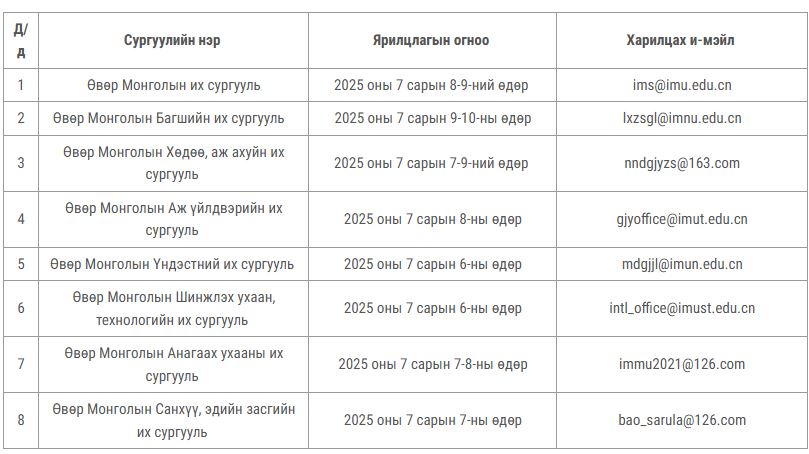 | ӨМӨЗО-ы Ардын засгийн газрын 2025-2026 оны хичээлийн жилийн тэтгэлэгт хөтөлбөрт оюутан элсүүлэх сургуулиудын ярилцлагын цагийн хуваарь |