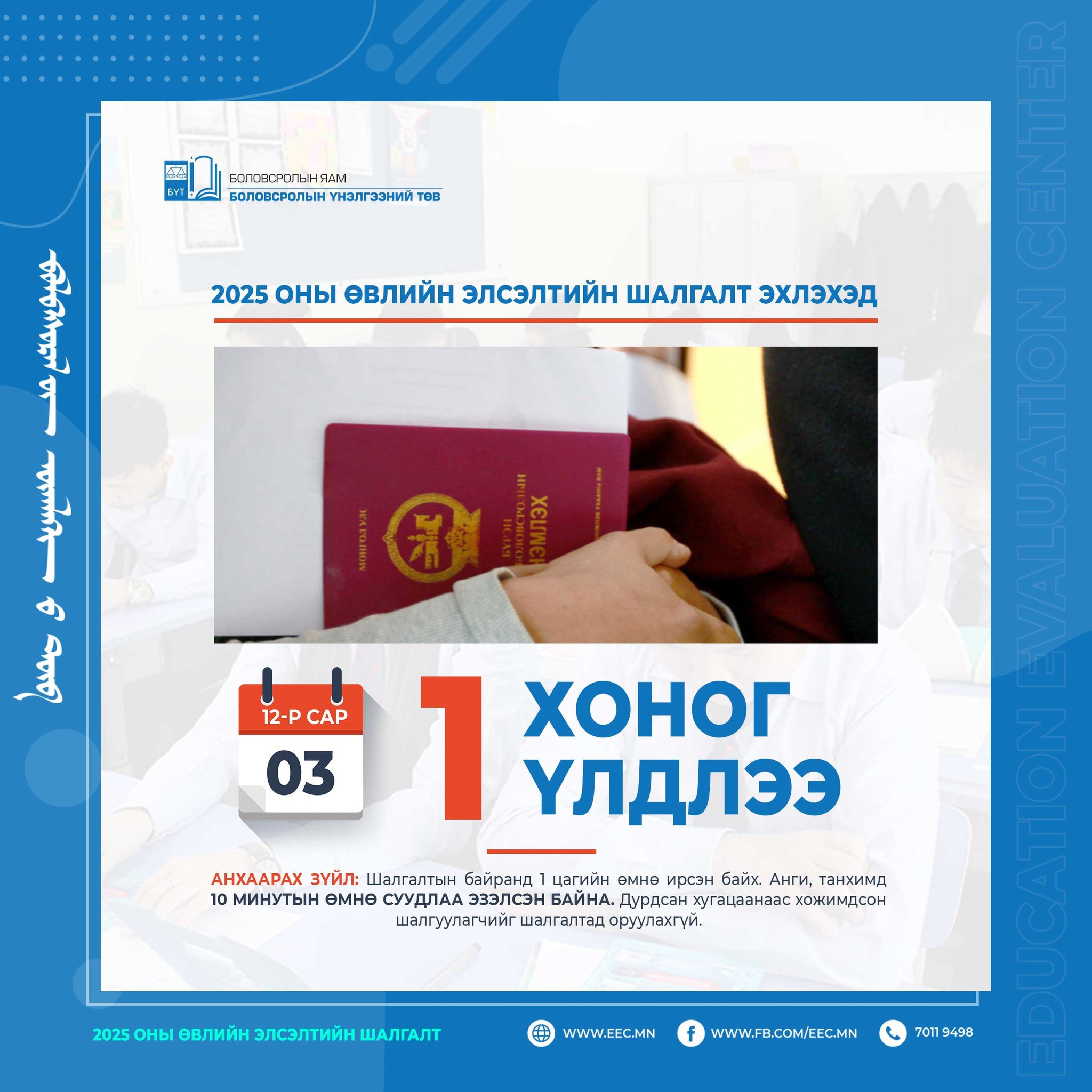 | 2025 оны өвлийн Элсэлтийн шалгалт эхлэхэд 1 хоног үлдлээ. |