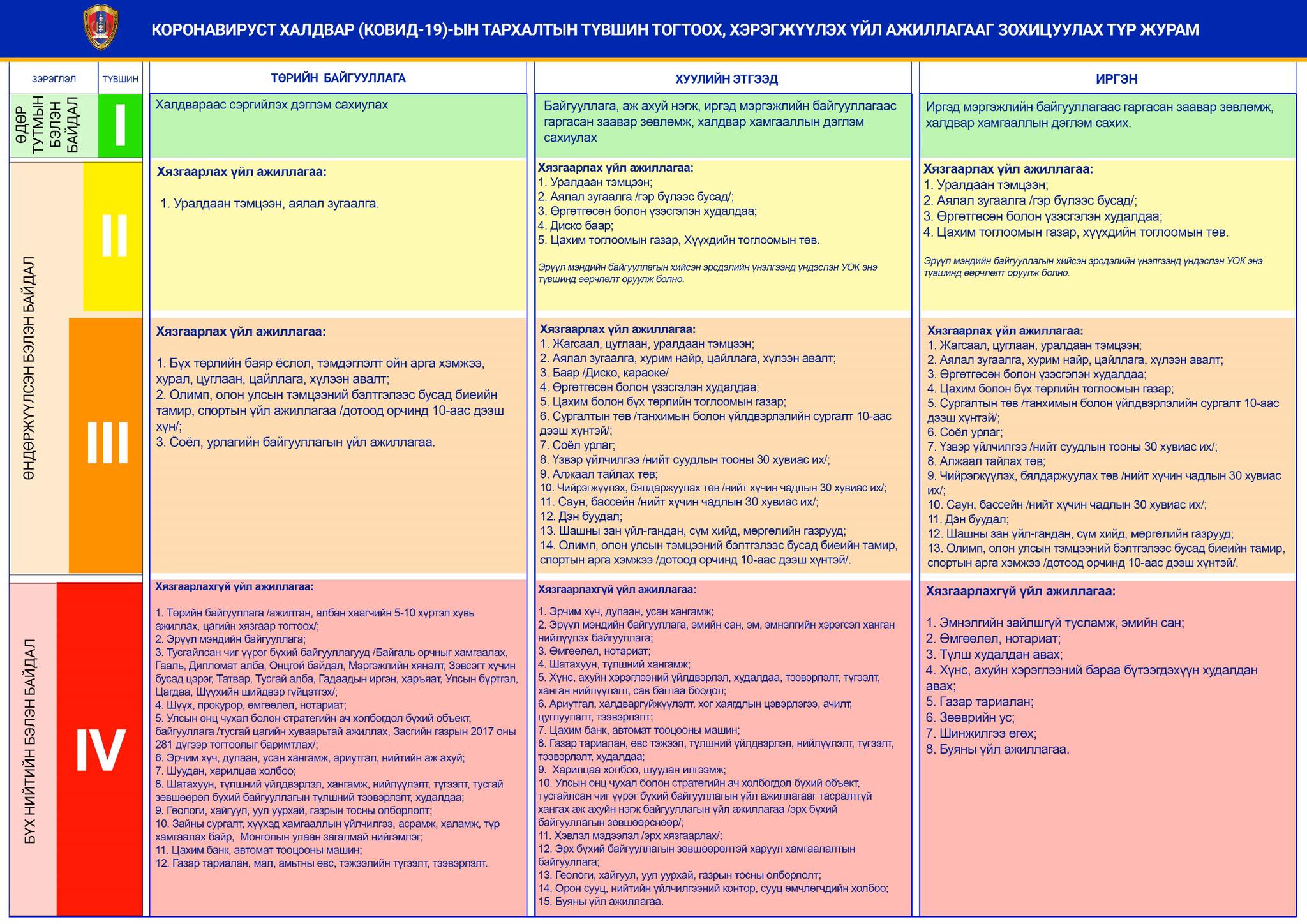 Ингэхдээ халдвар хамгааллын тодорхой дэглэмийг сахиулна. Харин хүүхдийн тоглоомын төв, баар, цэнгээний газар, цахим тоглоомын газар, өргөтгөсөн үзэсгэлэн худалдаа, аялал зугаалга гэх мэт таван төрлийн үйл ажиллагааг эхний удаад нээхгүй” гэв.