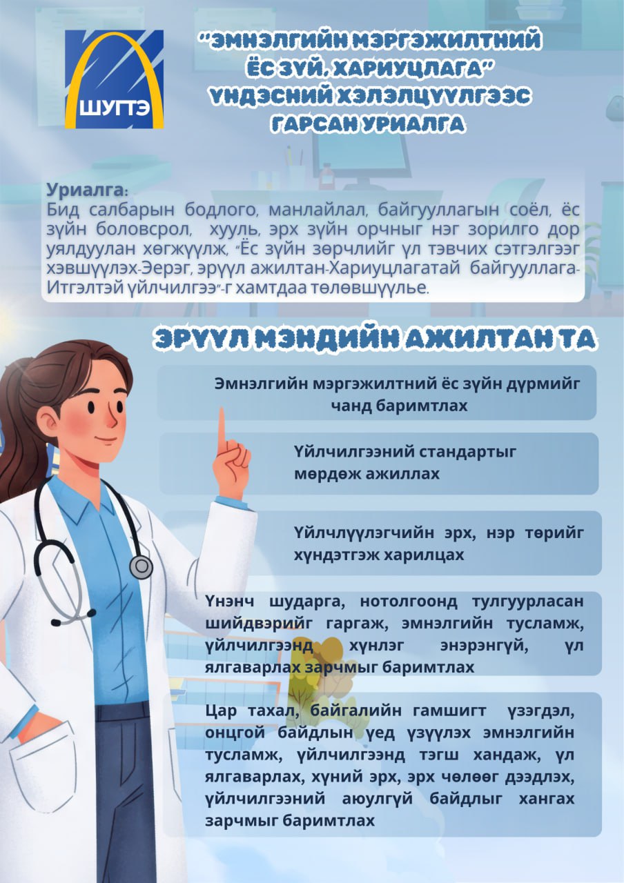| ЭМНЭЛГИЙН МЭРГЭЖИЛТНИЙ ЁС ЗҮЙ, ХАРИУЦЛАГА” ҮНДЭСНИЙ ХЭЛЭЛЦҮҮЛГЭЭС ГАРСАН УРИАЛГА, ЗӨВЛӨМЖ |
