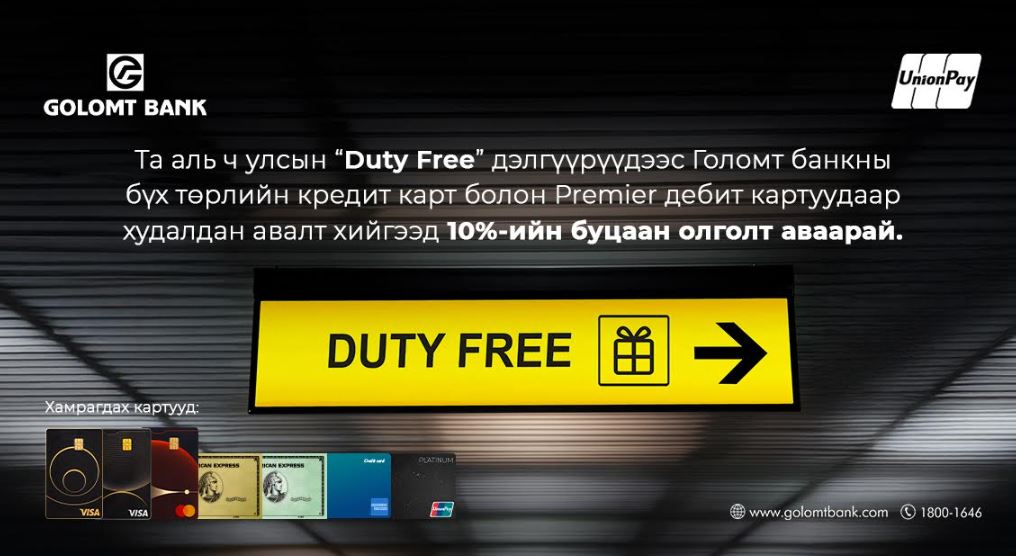 | Голомт банкны картаар Duty free дэлгүүрт төлбөрөө төлөөд 10%-ийн буцаан олголт аваарай |