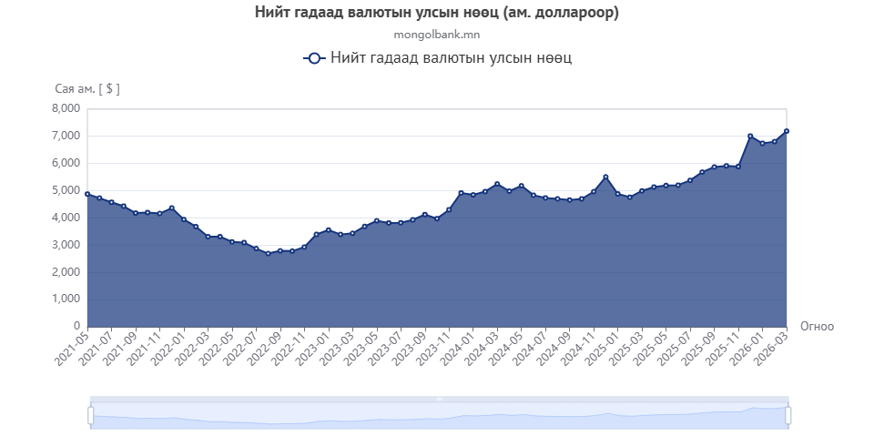 Монгол Улсын гадаад валютын нөөцийн хэмжээ 2026 оны 1 дүгээр улирлын эцсийн гүйцэтгэлээр 7,187.8 сая ам.долларт хүрч оны эхнээс 182.5 сая ам.доллароор өсөж, түүхэн дээд түвшинд хүрлээ. Энэ нь валютын төлбөртэй барааны импортын 8.4 сарын хэрэгцээ, бараа болон үйлчилгээний импортын 5.6 сарын хэрэгцээ, богино хугацаат гадаад өр төлбөрийг 275 хувь тус тус хангах түвшинд буюу олон улсад өргөн ашигладаг нөөцийн хүрэлцээт байдлын шалгуурыг хангаж байгаа юм.