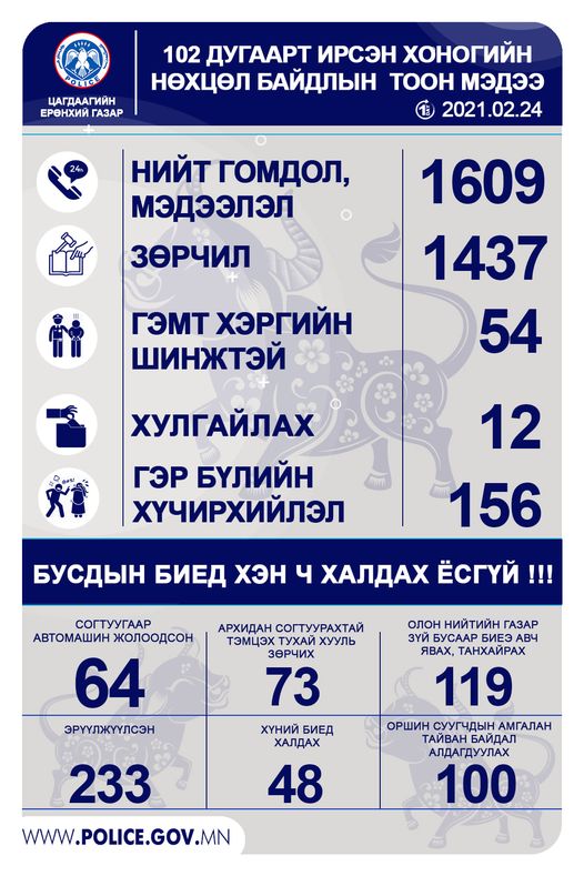 Өнгөрсөн 24 цагийн хугацаанд Цагдаагийн ерөнхий газрын 102 дугаарын утсанд 1609 гомдол, мэдээлэл ирсэн байна. Үүнээс 1437 зөрчил, гэмт хэргийн шинжтэй 54, хулгайлах 12, гэр бүлийн хүчирхийллийн шинжтэй 156 дуудлага, мэдээлэл бүртгэгджээ.