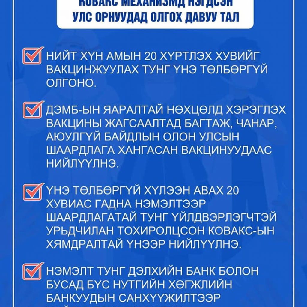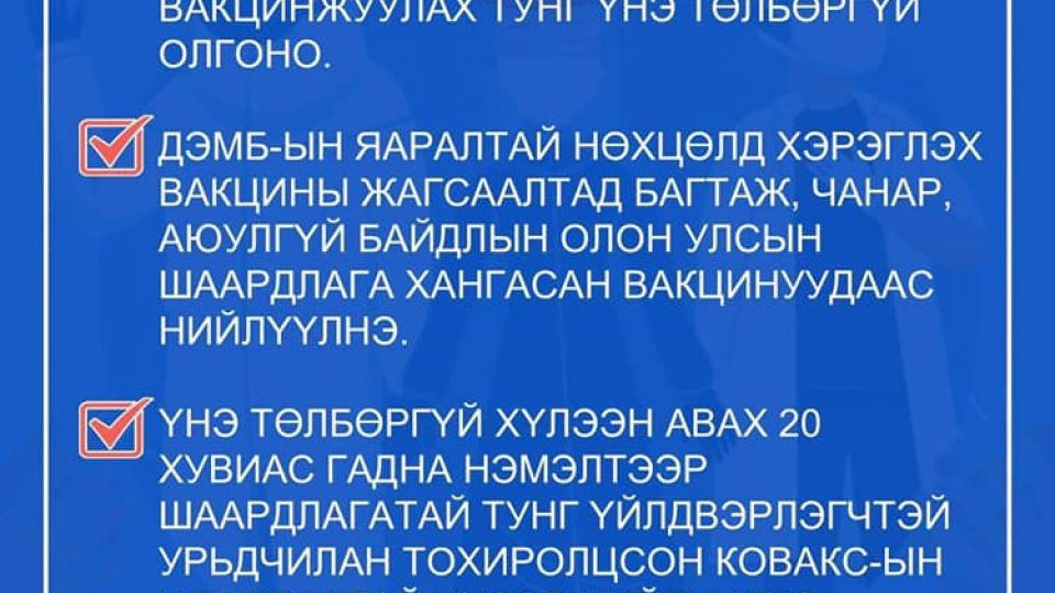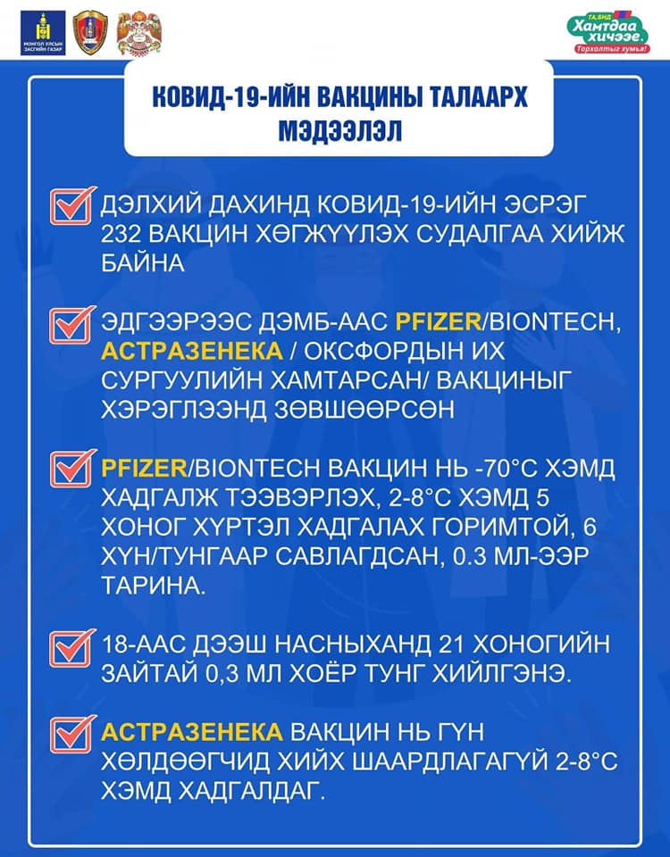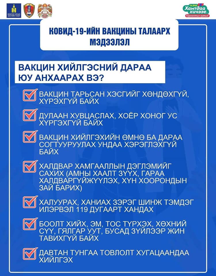 Улаанбаатар хотод өнөөдрөөс эхлэн, өдөр бүр 15000-25000 хүнийг 86 цэгээр вакцинжуулна. Худалдаа үйлчилгээны салбар, бүх шатны боловсролын салбарын багш ажилчдыг ирэх долоо хоногт хамруулна. Бусад иргэд сайн дураараа Астра Зенека, Спутник, Синовак вакцин хийлгэж болно. Вакцин хийлгэхээс өмнө болон хийлгэсний дараах санамжийг анхаараарай.
