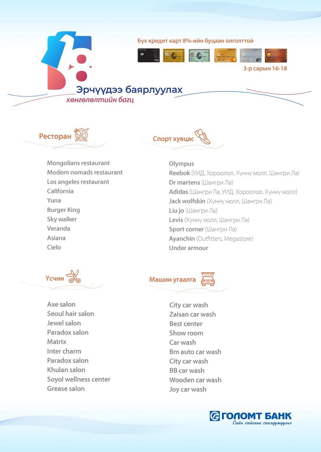Тухайлбал, тэмдэглэлт баярын өдрөөр харилцагч та халамжит хань, гэр бүл, хайртай хүмүүстээ зориулан бидний хамтран ажилладаг Lui Jo, Under Armorзэрэг 10 орчимспортын брэнд дэлгүүрүүдээс сонголтоо хийж, Mongolians, Yuna , Modern Nomads зэрэг тохь тухтай дээд зэргийн 10 орчим зоогийн газраас сонгон үйлчлүүлж, баярын бэлэг бариарай.