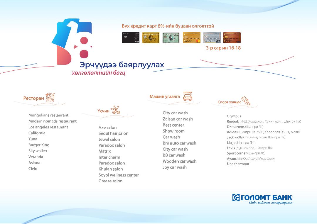 Харилцагч та 2021.03.16-18-ны өдрийг дуустал хамтрагч үйлчилгээний байгууллагуудын Голомт банкны карт уншигч төхөөрөмж дээрГоломт банкны кредит картаар худалдан авалт хийгээд энэхүү урамшуулалд оролцоорой.Таны худалдан авсан бүтээгдэхүүн үйлчилгээний үнийн дүнгийн 8%-ийн буцаалт 2021.03.26-ний дотор төлбөр хийсэн кредит карт руу тань орно.