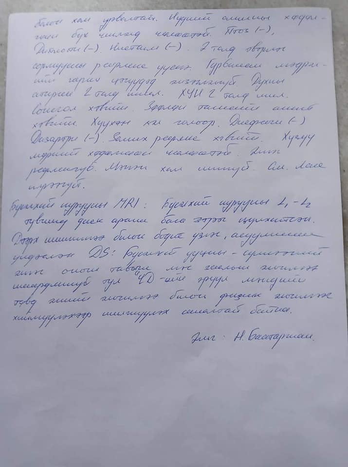 Энэ талаар тэрбээр "Намайг Г.Бямбасүрэн гэдэг. Би 1990 оны арванхоёрдугаар сард төрсөн. Хувийн эмнэлэгт ажилладаг. Вакцин хийлгээд хоёр хөл мэдээгүй болсон. Вакцинаа энэ сарын 15-ны даваа гарагт 16:00 цагт хийлгэсэн. Үүнээс 10 минутын дараа ажиглалт хийхэд зүгээр байсан. Ингээд гараад 40 орчим минутын дараа дотор муухайрч, биеийн байдал тавгүй болсон. Ингээд ажил дээрээ ирээд бөөлжиж явж чадахаа больсон. Удалгүй эмнэлгийн сувилагч рингер, аньлгин, демидрол хийсэн. Гишгэж чадахгүй байсан учраас Хан-Уул дүүргийн эмнэлэгт дуудлага өгч эмнэлэгт хүргэгдсэн. Үүнээс хойш биеийн байдал сайжрахгүй байна. Үүнээс хойш хэд хэдэн удаа эмнэлэгт үзүүлж, одоо Хан-Уул дүүргийн эмнэлэгт хэвтэн эмчлүүлж байна. Одоо ганцаараа явж чадахгүй хүнээр түшүүлж явж байгаа" гэлээ.