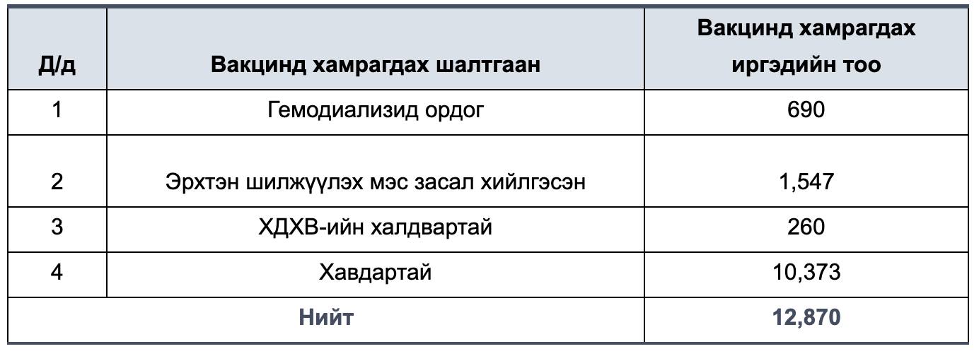 Манай улс Ковакс хөтөлбөрийн хүрээнд 25740 тун “Pfizer” вакциныг өчигдөр хүлээн авсан аж. Уг вакцинд хамрагдах боломжтой хүмүүсийн талаар ЭМЯ-ны хэлтсийн дарга Г.Болдмаа мэдээлэл өглөө. Тэрбээр “Зорилтот бүлгийн иргэдийг “Pfizer” вакцинаар дархлаажуулна. Гемодиализд ордог 690, эрхтэн шилжүүлэх мэс засал хийлгэсэн 1547, ХДХВ-ийн халдвартай 260, хавдартай 10373 нийт 12870 хүнийг эмчийн зааврын дагуу дархлаажуулна” гэлээ. “Pfizer” вакциныг 18-аас дээш насныхан 21 хоногийн зайтай 0.3 миллилитр хоё тунг хийлгэх юм байна.