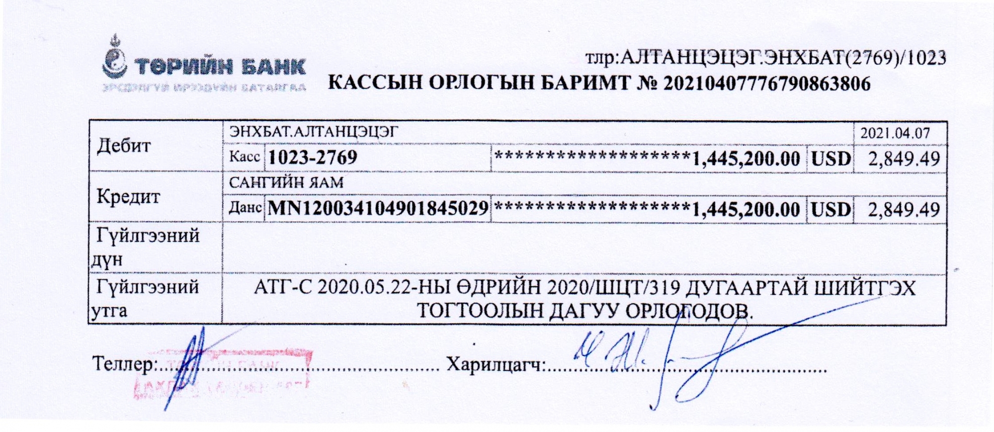 Хан-Уул дүүргийн Эрүүгийн хэргийн анхан шатны шүүхийн 2020/ШЦТ/319 дүгээр тогтоолоор 1.4 сая ам.долларыг улсын орлого болгохоор шийдвэрлэсэн нь Улсын дээд шүүхээр хянагдаж, эцэслэн хүчин төгөлдөр болсон. Үүний дагуу Авлигатай тэмцэх газраас 2021 оны дөрөвдүгээр сарын 7-нд Сангийн яамны Төрийн сан дахь төсвийн орлогын дансанд дээрх хураагдсан мөнгийг шилжүүллээ.