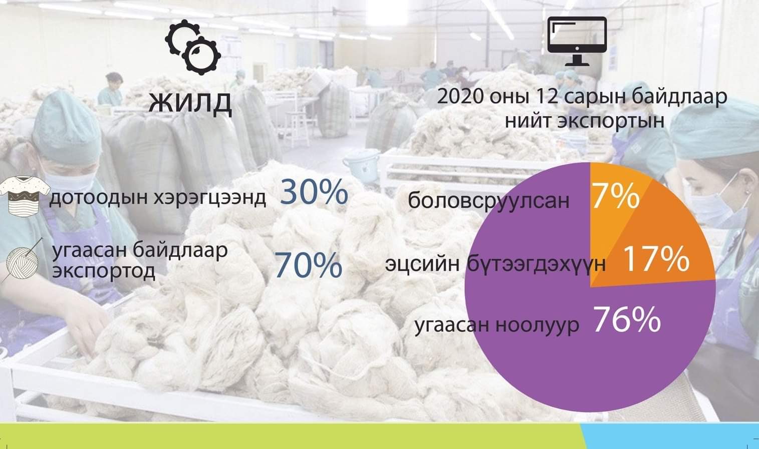 2020 оны 12 сарын байдлаар ноолуурын экспортын хэмжээ 243,5 сая ам.доллар байна. Ноолуурын нийт экспортын 76 хувийг угаасан, 7 хувийг боловсруулсан ноолуур, 17 хувийг эцсийн бүтээгдэхүүн эзэлжээ.