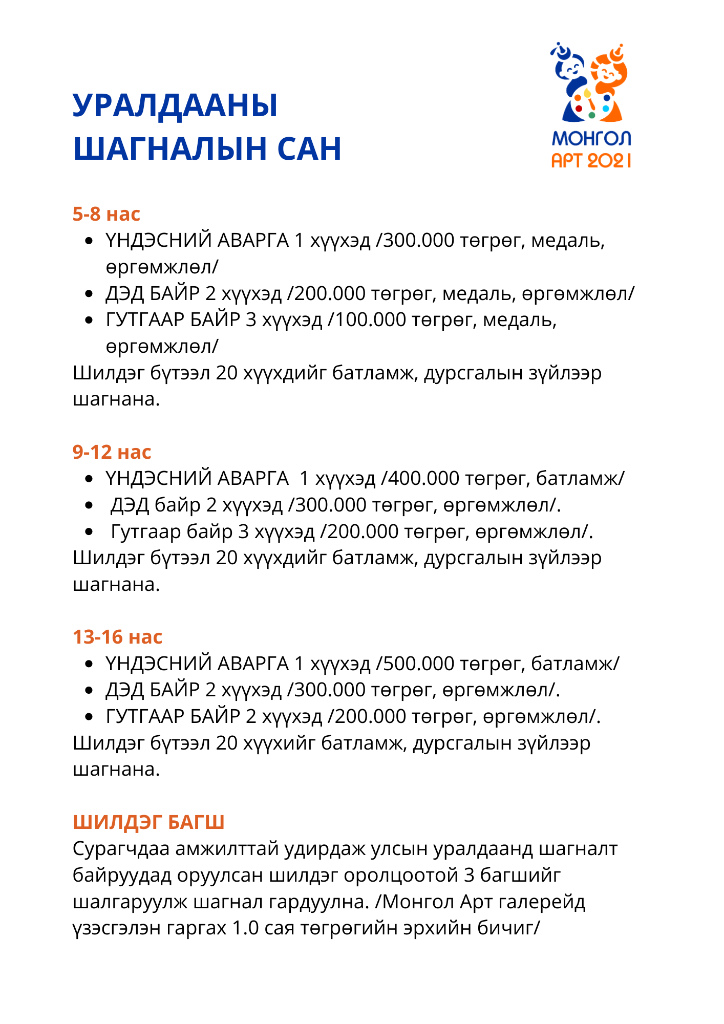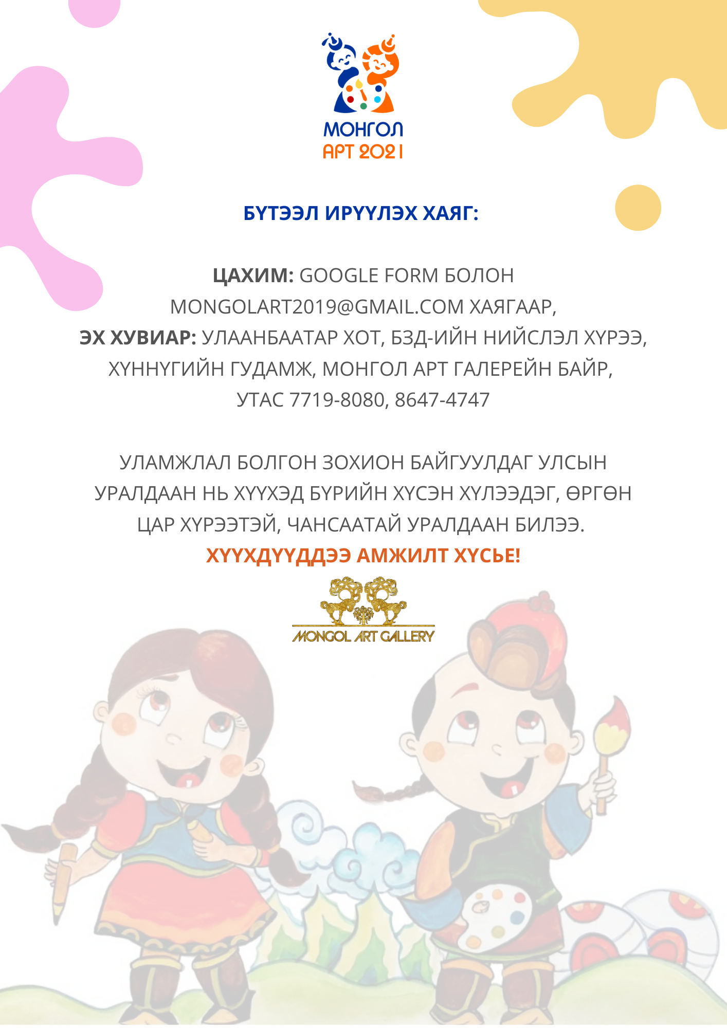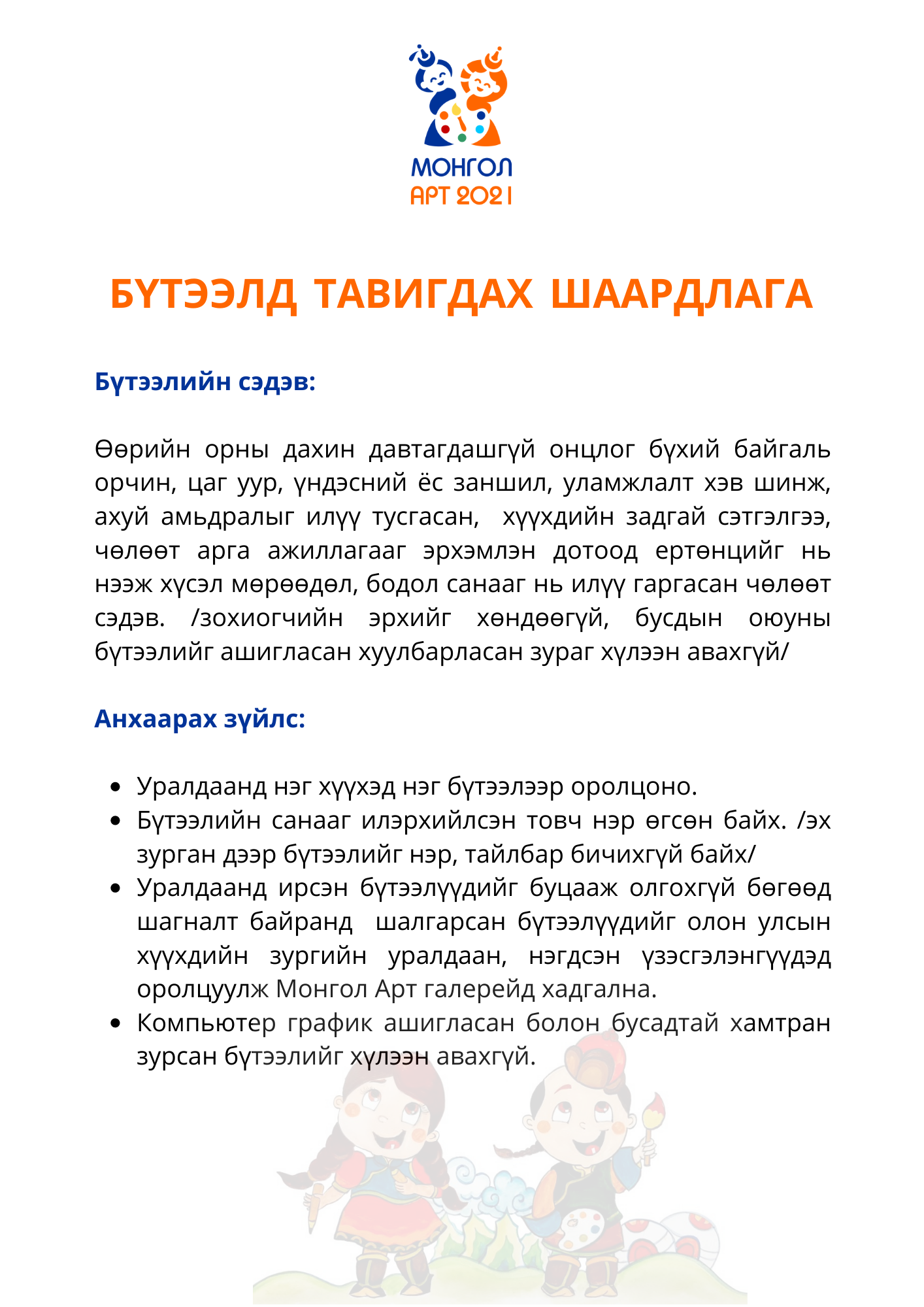| Хүүхдийн уран зургийн “МОНГОЛ АРТ 2021” улсын уралдаан зарлалаа |