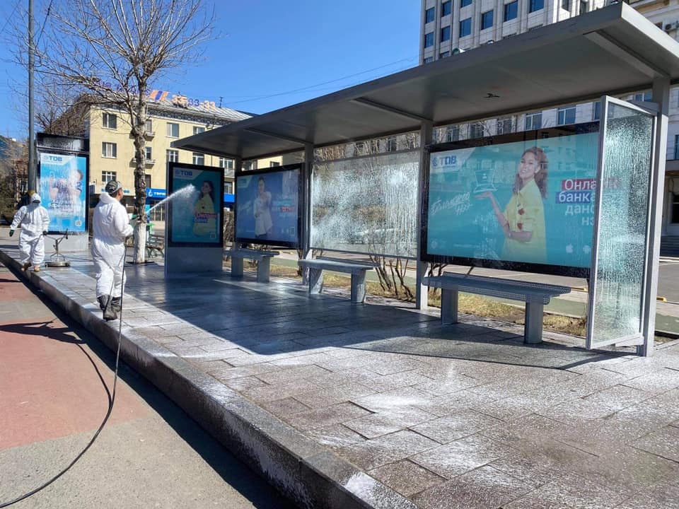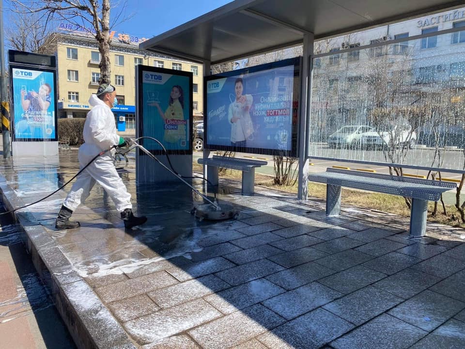 | Бохирдол ихтэй 72 автобусны буудлыг цэвэрлэгээний бодис, шүршигч төхөөрөмжөөр угааж байна |