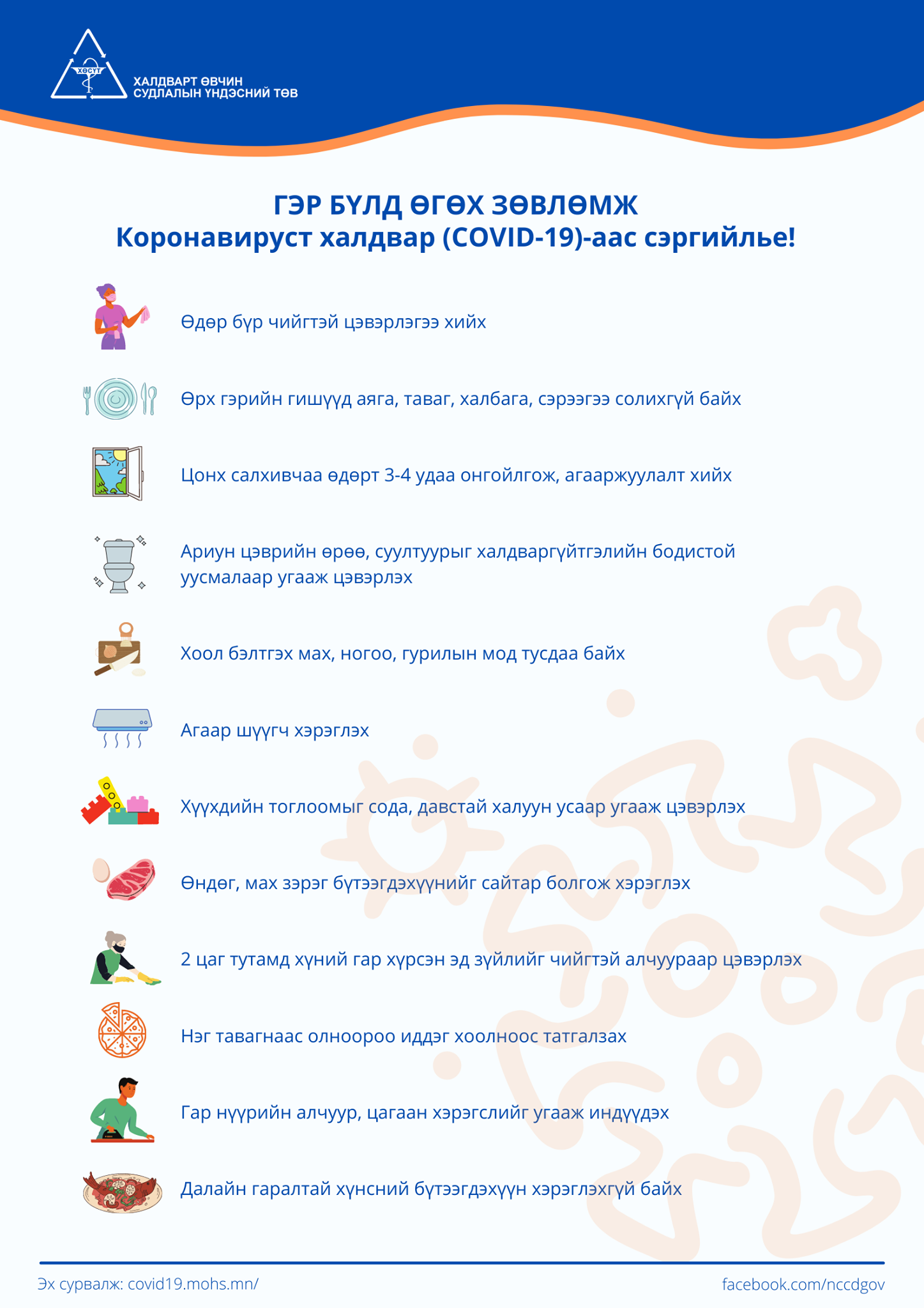 Коронавирусийн халдварын үед гэр бүлийн орчинд халдвар хамгааллыг мөрдөх зөвлөмжийг ХӨСҮТ-өөс хүргэж байна. Үүнд: