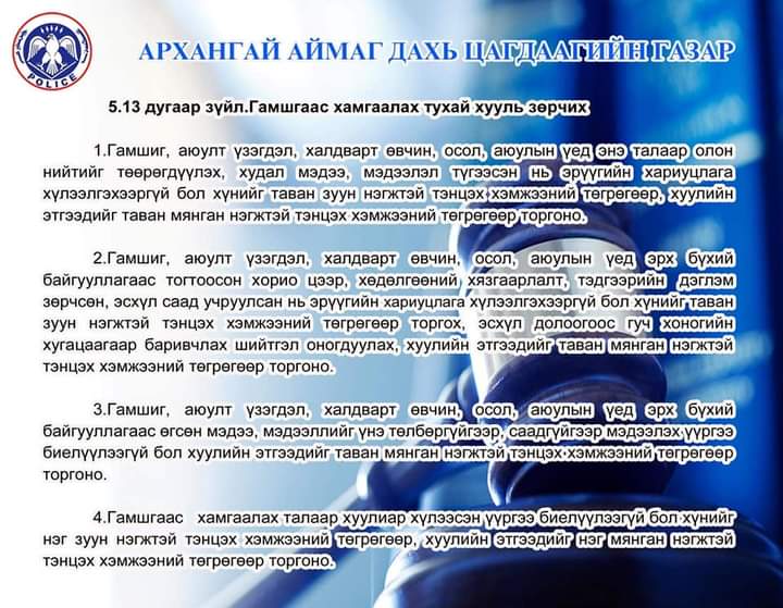 Архангай аймгийн Цагдаагийн газраас бүх нийтийн бэлэн байдалд шилжсэн өдрүүдэд хорио цээрийн дэглэм зөрчиж, зөвшөөрөлгүй аймаг, сумын нутаг дэвсгэрт нэвтэрсэн дөрвөн иргэнд зөрчлийн хэрэг нээн шалгаж байна. Хуульд заасны дагуу эрх бүхий байгууллагаас гаргасан нийтээр дагаж мөрдөх дүрэм, журам, хөдөлгөөний хязгаарлалт, хорио цээрийн дэглэм зөрчсөн 138 иргэнд торгох шийтгэл оногдуулж, хариуцлага тооцжээ.
