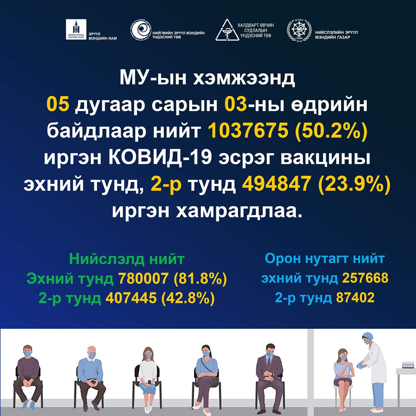 Улсын хэмжээнд тавдугаар сарын 3-ны өдрийн мэдээгээр 1 сая 37675 иргэн коронавирусийн эсрэг вакцинаа хийлгэжээ. Энэ нь зорилтот насныхны 50.2 хувь бөгөөд үүнээс 494847 иргэн хоёр дахь тунг хийлгэсэн хэмээн ЭМЯ-наас мэдээллээ.