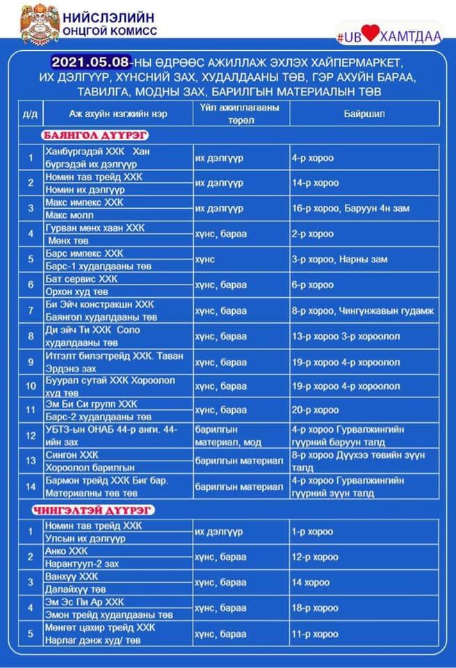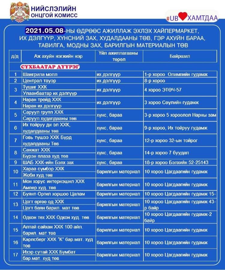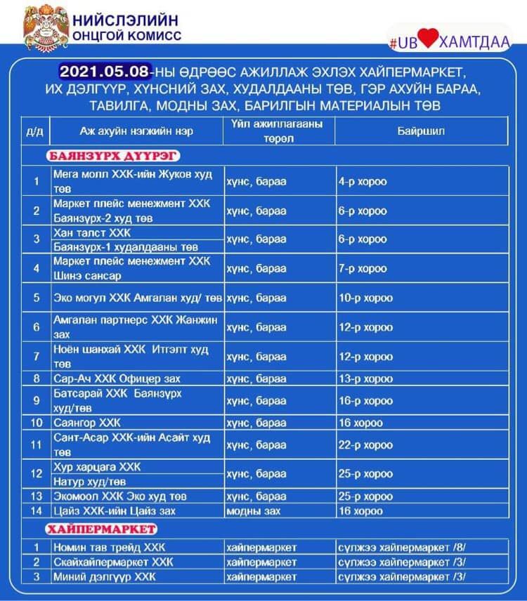 Гамшгийн үеийн "улаан" түвшинг "улбар шар" түвшинд шилжүүлж, бууруулсантай холбогдуулан зах, худалдааны төвүүдийг үе шаттайгаар нээж байна. Тэгвэл өнөөдөр үйл ажиллагаагаа хэвийн явуулж буй худалдаа, үйлчилгээний байгууллагуудыг танилцуулж байна.